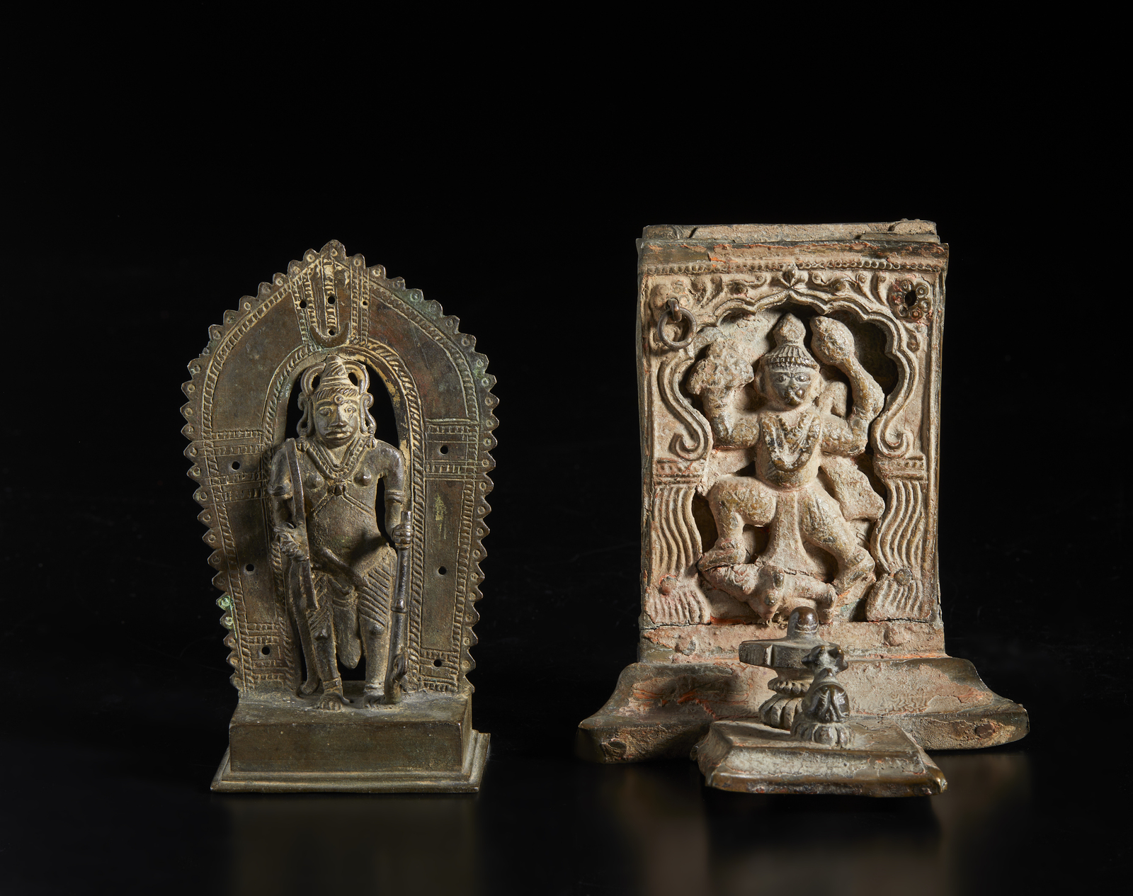 India, XIX secolo . . Cm 11,50 x 13,50. Uno raffigurante Shivalinga davanti ad una stele raffigurante Humayun, cospicue tracce di policromia; l'altro tribale raffigurante una divinità tribale.