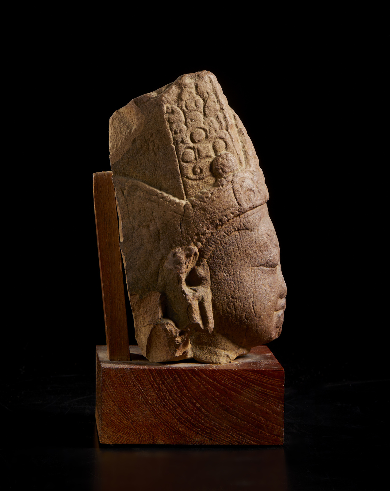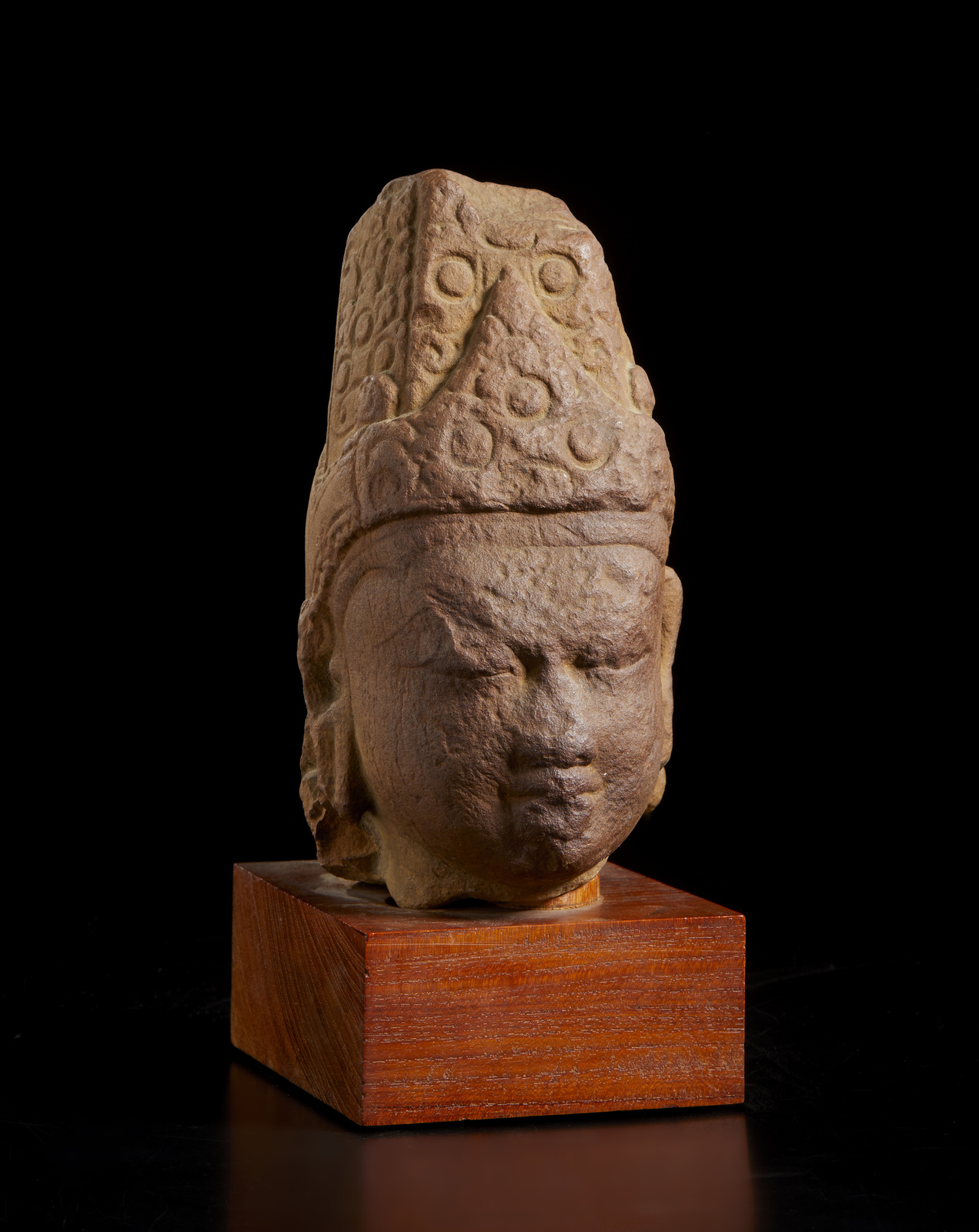 India Centrale, XII secolo . . Cm 11,00 x 18,50. Testa in pietra raffigurante il volto di Vishnu con alto ed elaborato coronamento. Nonostante la superficie sia molto usurata, si notano ancora deboli tracce dell'arco sopraccigliare appuntito, tipico del periodo, così come i grandi orecchini.