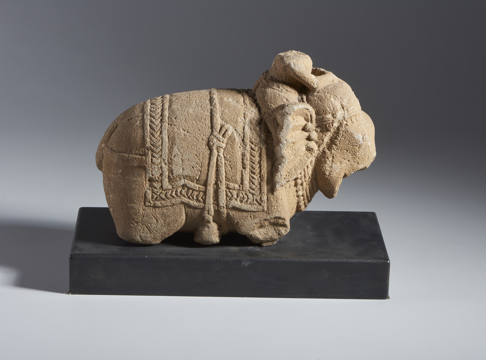 India, forse XVI-XVII secolo . . Cm 40,50 x 28,00 x 15,00. Scultura in pietra arenaria raffigurante quel che resta di un elefante con mahout. La mancanza delle parti salienti della figura umana e animale rende l'attribuzione basata sulle caratteristiche stilistiche molto difficile.