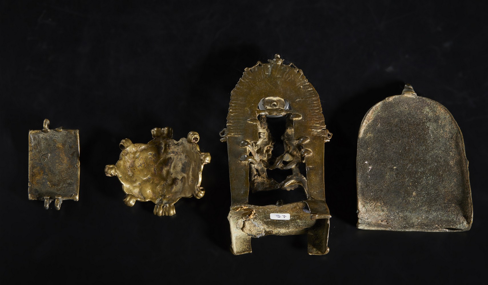 India popolare, XVIII-XIX secolo . . Cm 7,00 x 14,00. Include: Due altari devozionali in fusione di lega di rame raffiguranti Shiva, Parvati e figli e due ornamenti da braccio decorati con figure in rilievo.