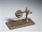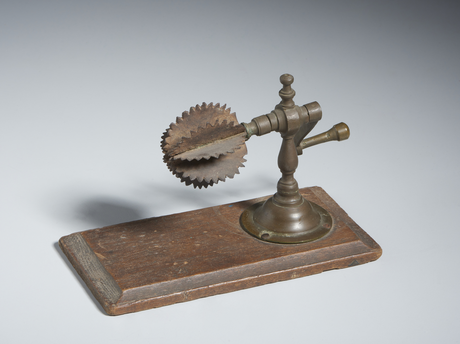 India, XX secolo . . Cm 20,50 x 14,00. Utensile per svuotare le noci di cocco, in bronzo a manovella con otto palette in ferro dentellato.
