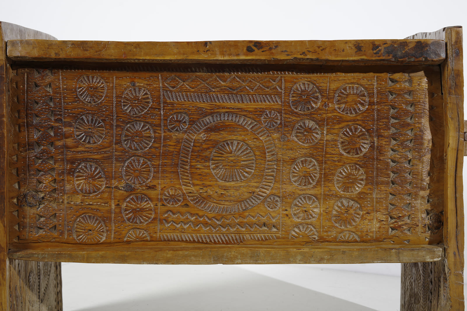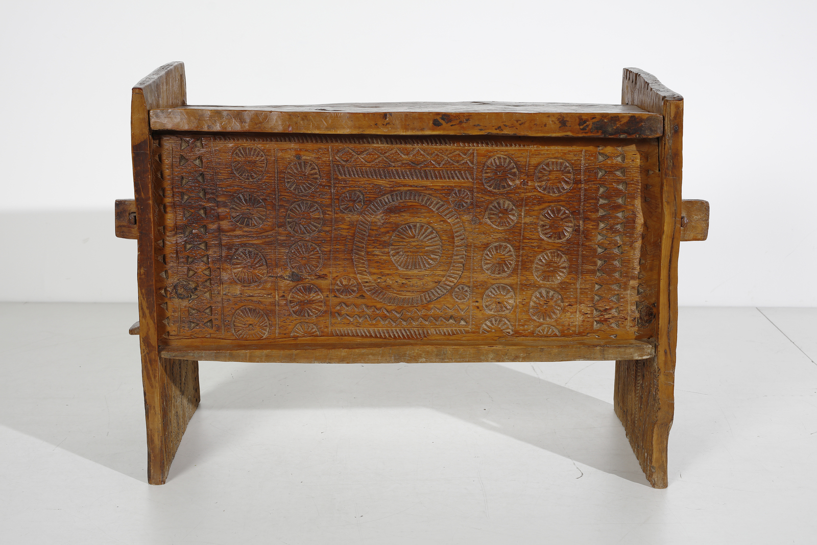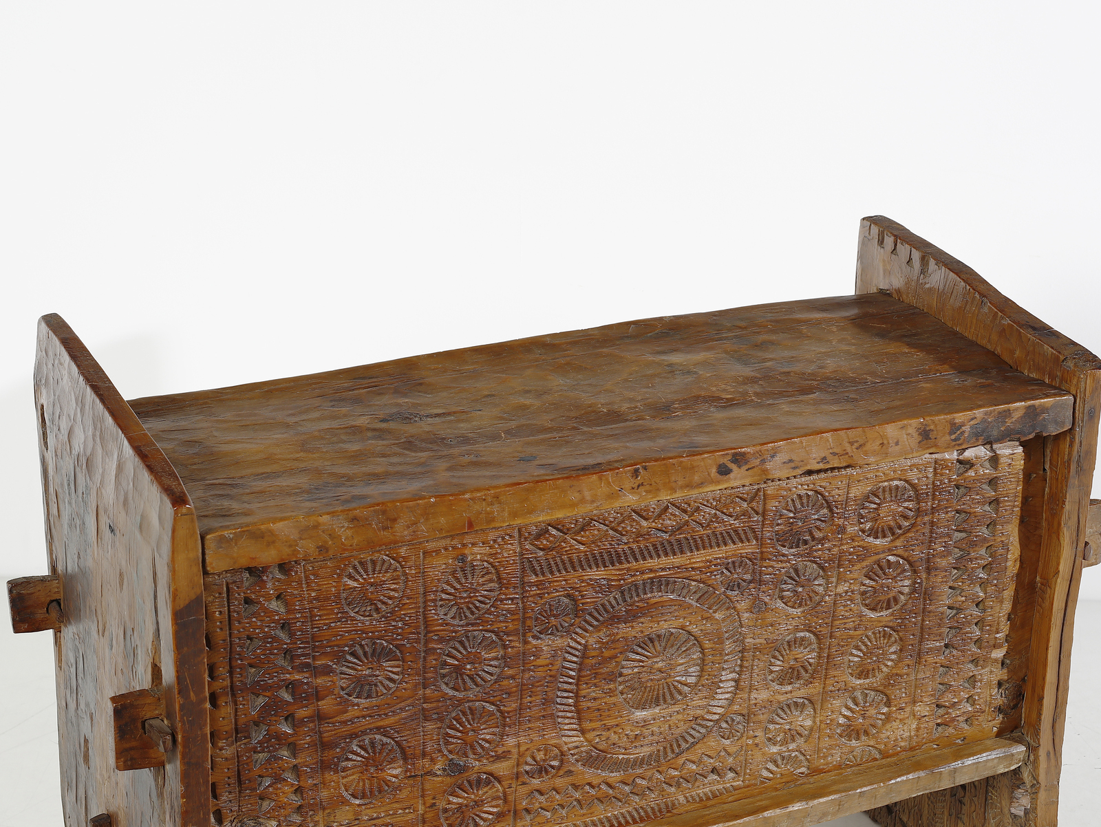 Valle dello Swat, XIX - inizio XX secolo . . Cm 94,50 x 135,00. Baule tribale per la dote in legno intagliato con chevron, girali, decori geometrici e floreali stilizzati su fronte e coperchio, interno ed esterno. Doppio marchio con lettere incise su uno del fianchi.