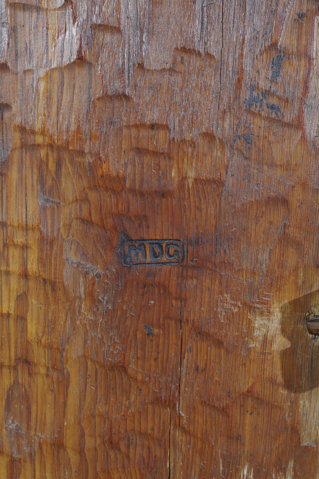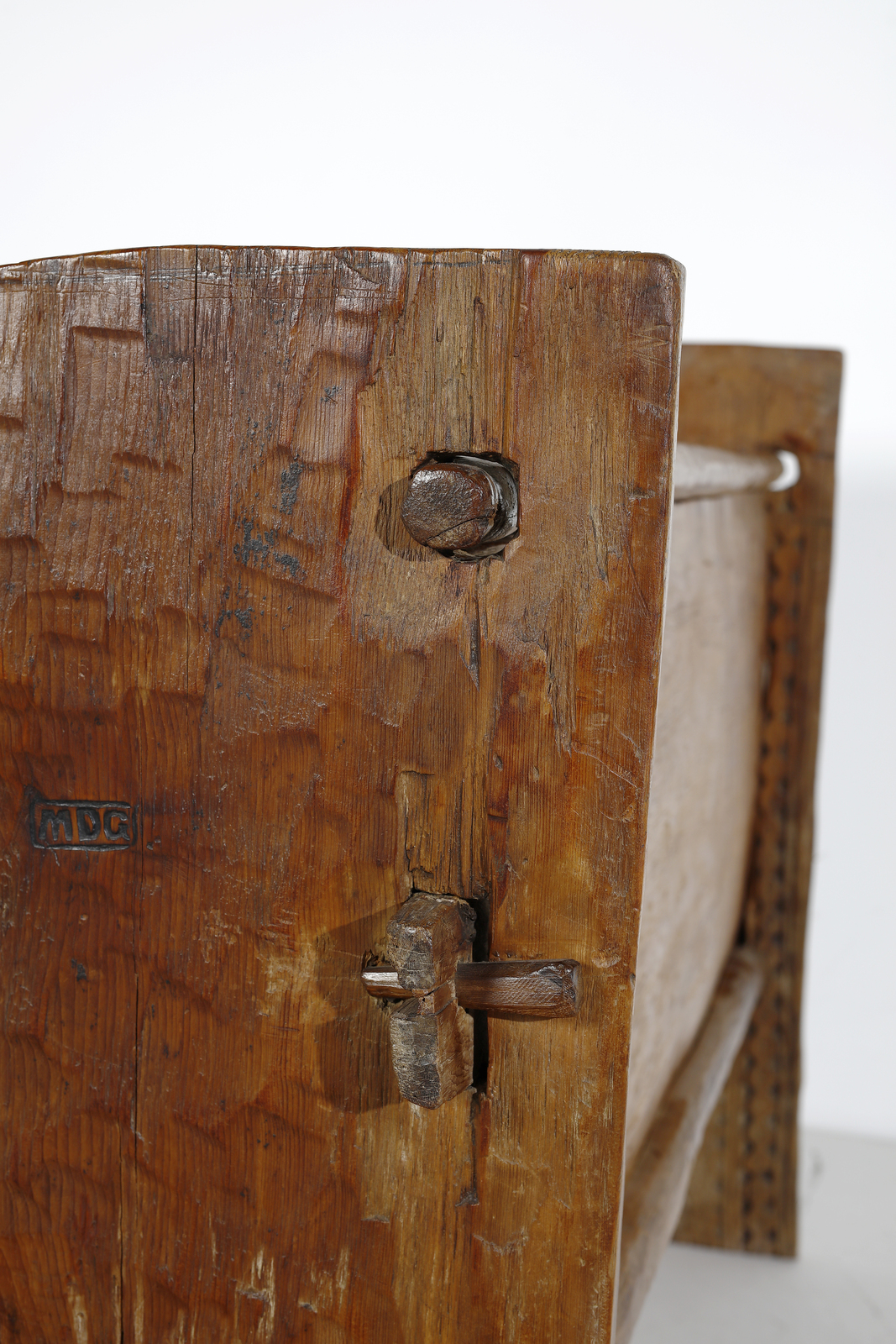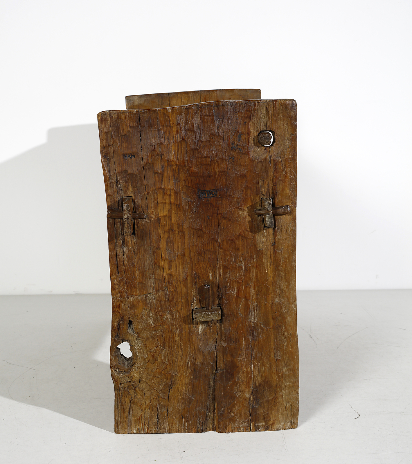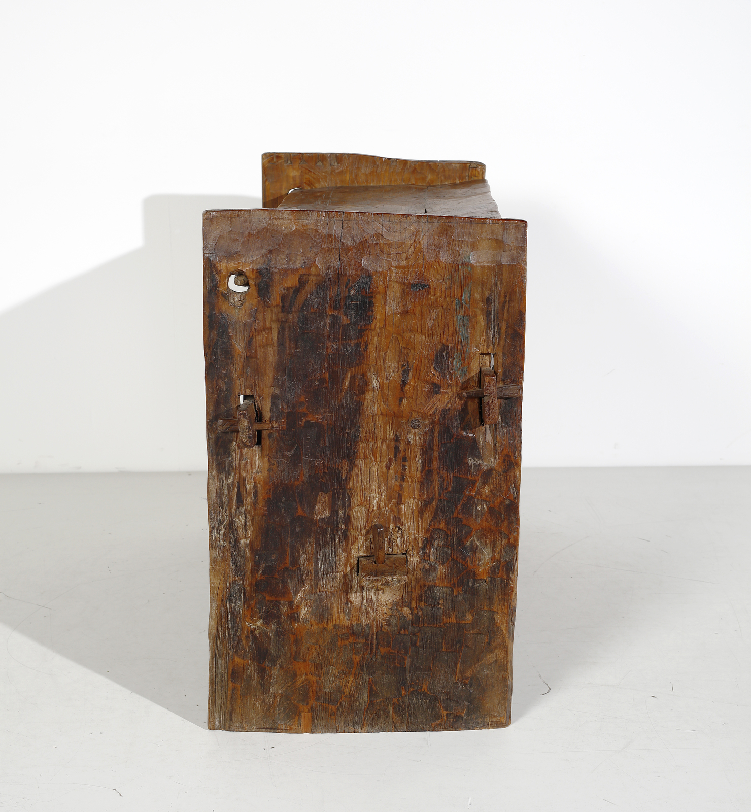 Valle dello Swat, XIX - inizio XX secolo . . Cm 94,50 x 135,00. Baule tribale per la dote in legno intagliato con chevron, girali, decori geometrici e floreali stilizzati su fronte e coperchio, interno ed esterno. Doppio marchio con lettere incise su uno del fianchi.
