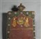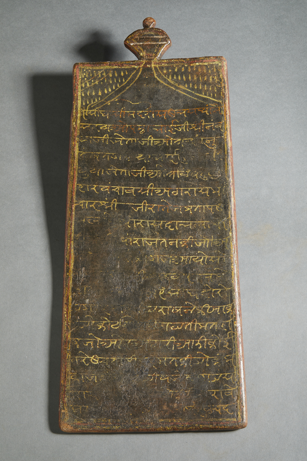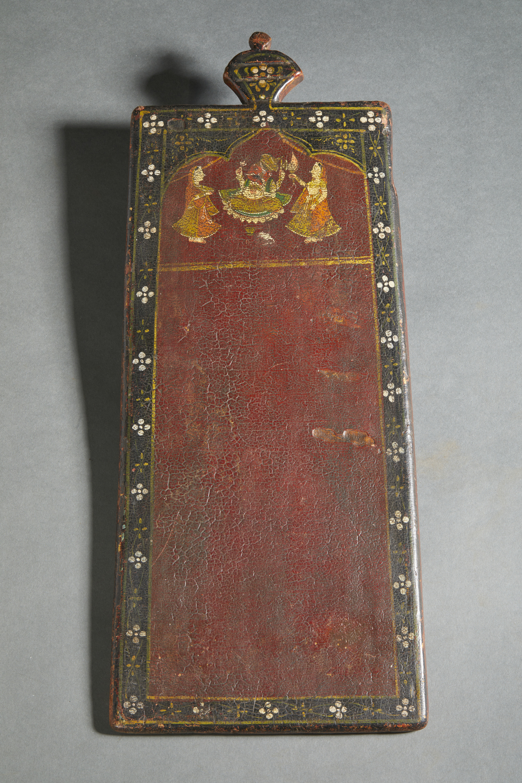 India Settentrionale, Rajasthan, XIX secolo . . Cm 21,50 x 51,80. Rettangolare, terminante con impugnatura a ventaglio, il fronte dipinto di rosso e decorato con raffigurazione di Ganesh tra attendenti; il retro reca lunga iscrizione in devanagari.
