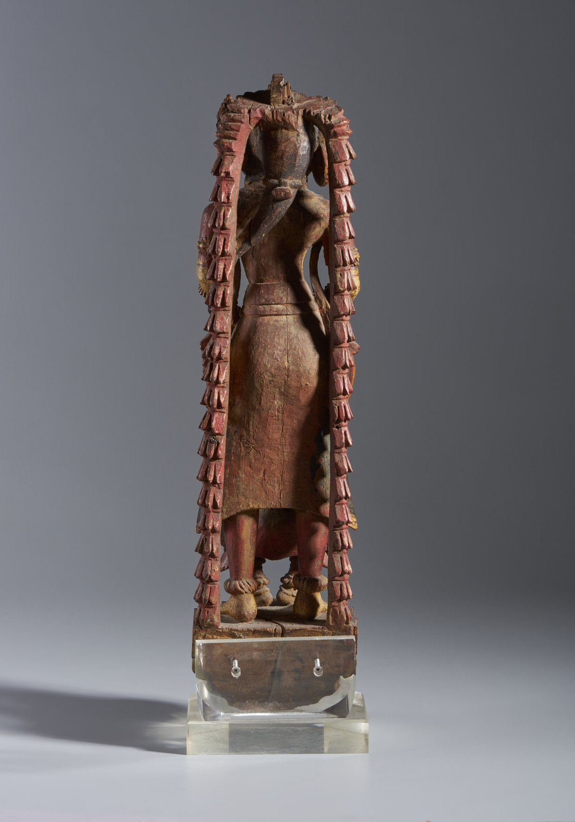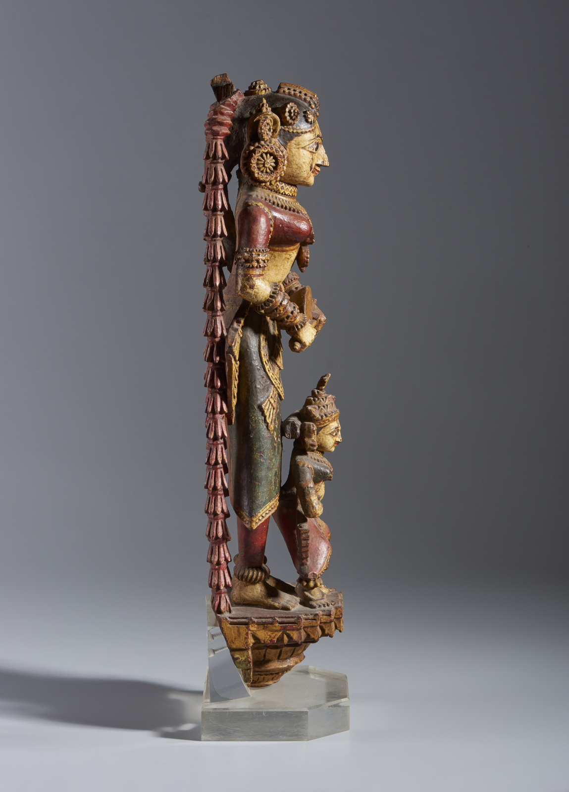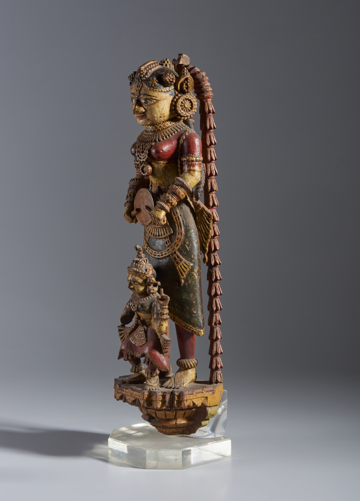 India, XX secolo . . Cm 22,00 x 82,00 x 19,00. Scultura in legno laccato raffigurante figura muliebre con tamburo e bambino, forse identificabili con Yashoda e Krishna bambino.