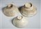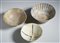 Iran, Kashan, XII - XIII secolo . . Cm 17,50 x 8,00. Tutte in pasta silicea, due decorate con quattro "incerte" righe blu, una tipologia decorativa già affermatasi nel periodo selgiuchide; l'altra decorata con fitta decorazione radiale blu su sfondo bianco a richiamare la simbologia solare.