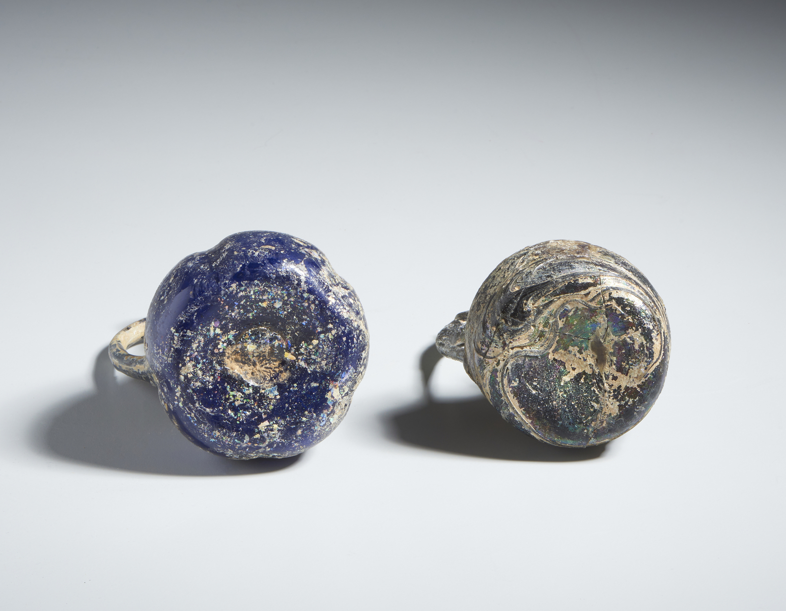 Persia o Siria, X-XII secolo . . Cm 9,00 x 17,50. Uno in vetro blu con corpo costolonato e poggiadito, una forma derivante dalla coeva toreutica; l'altro (13,5 x 8 cm) in vetro celeste con lungo manico e testa appuntita.