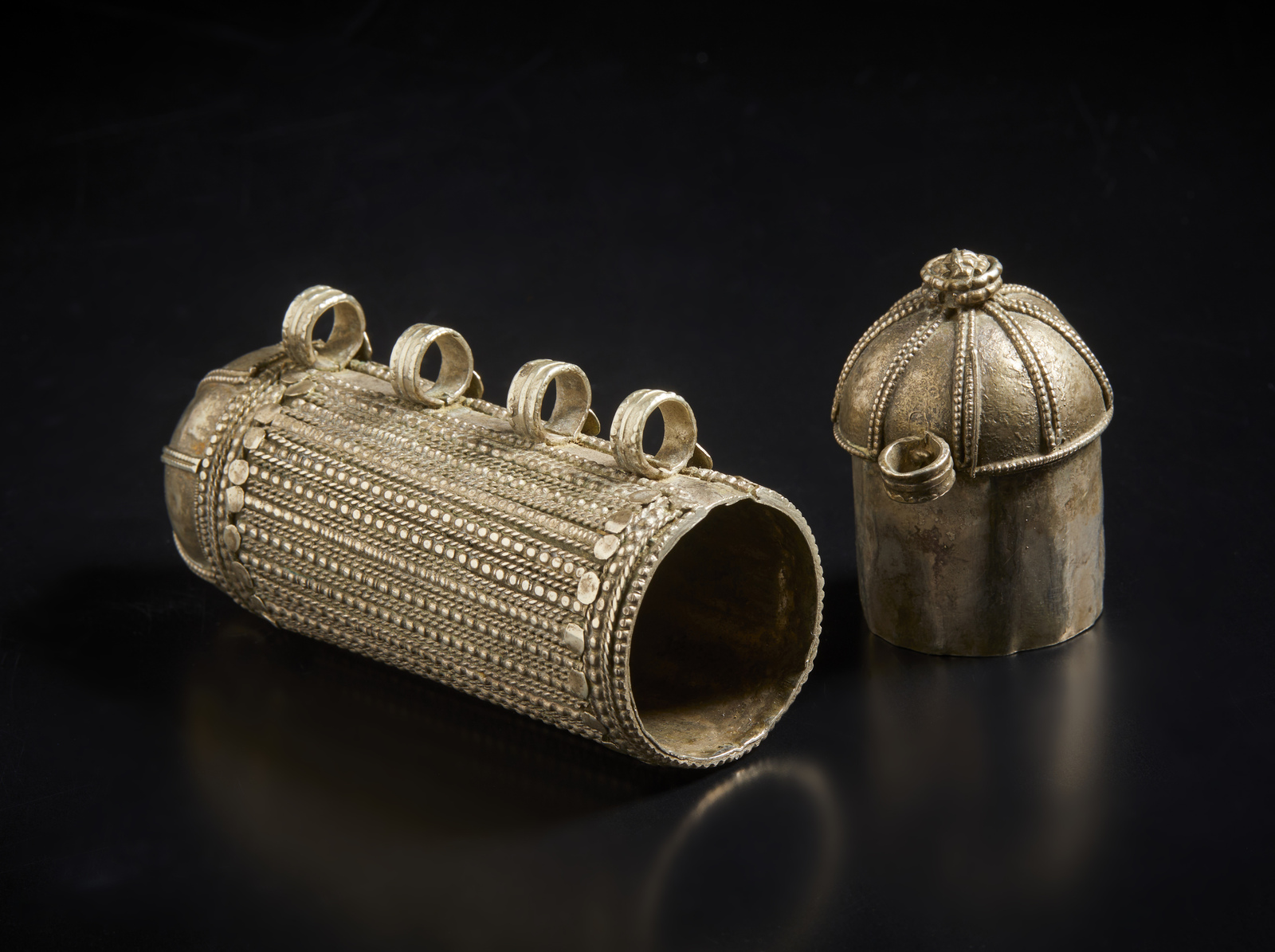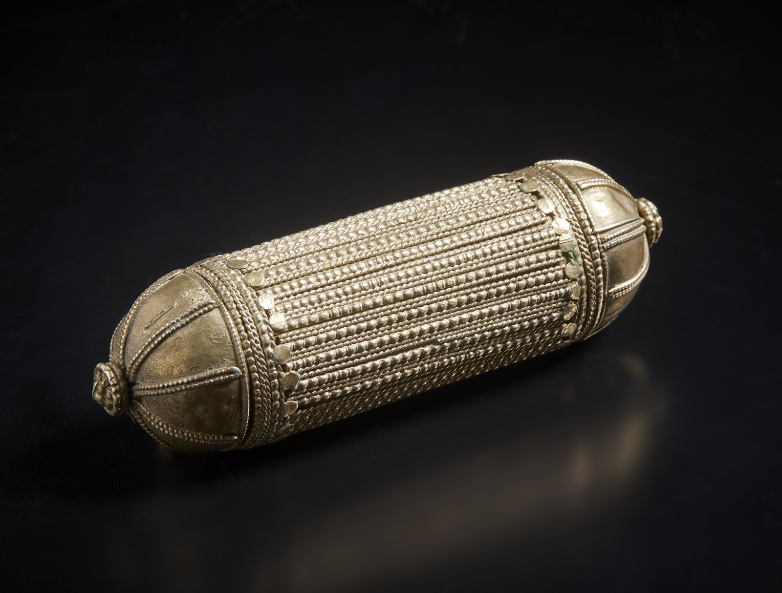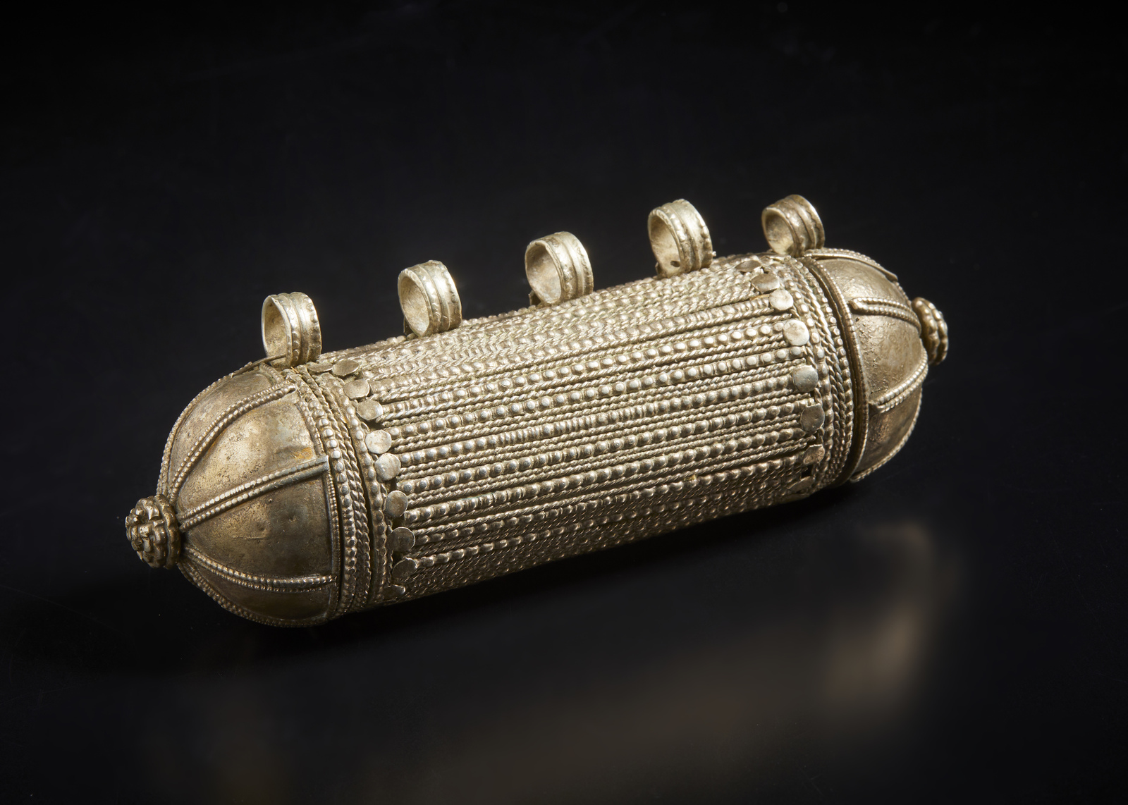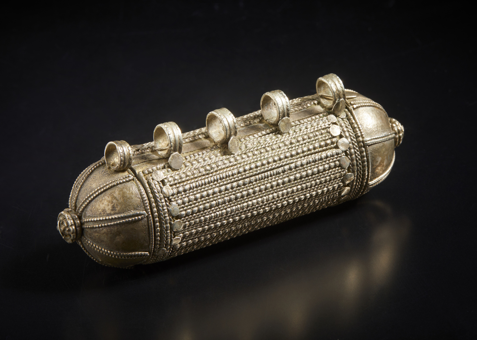 Yemen, XIX secolo . . Cm 5,50 x 14,50. Scatola cilindrica con funzione talismanica, usata per contenere rotoli con versi dal Corano.