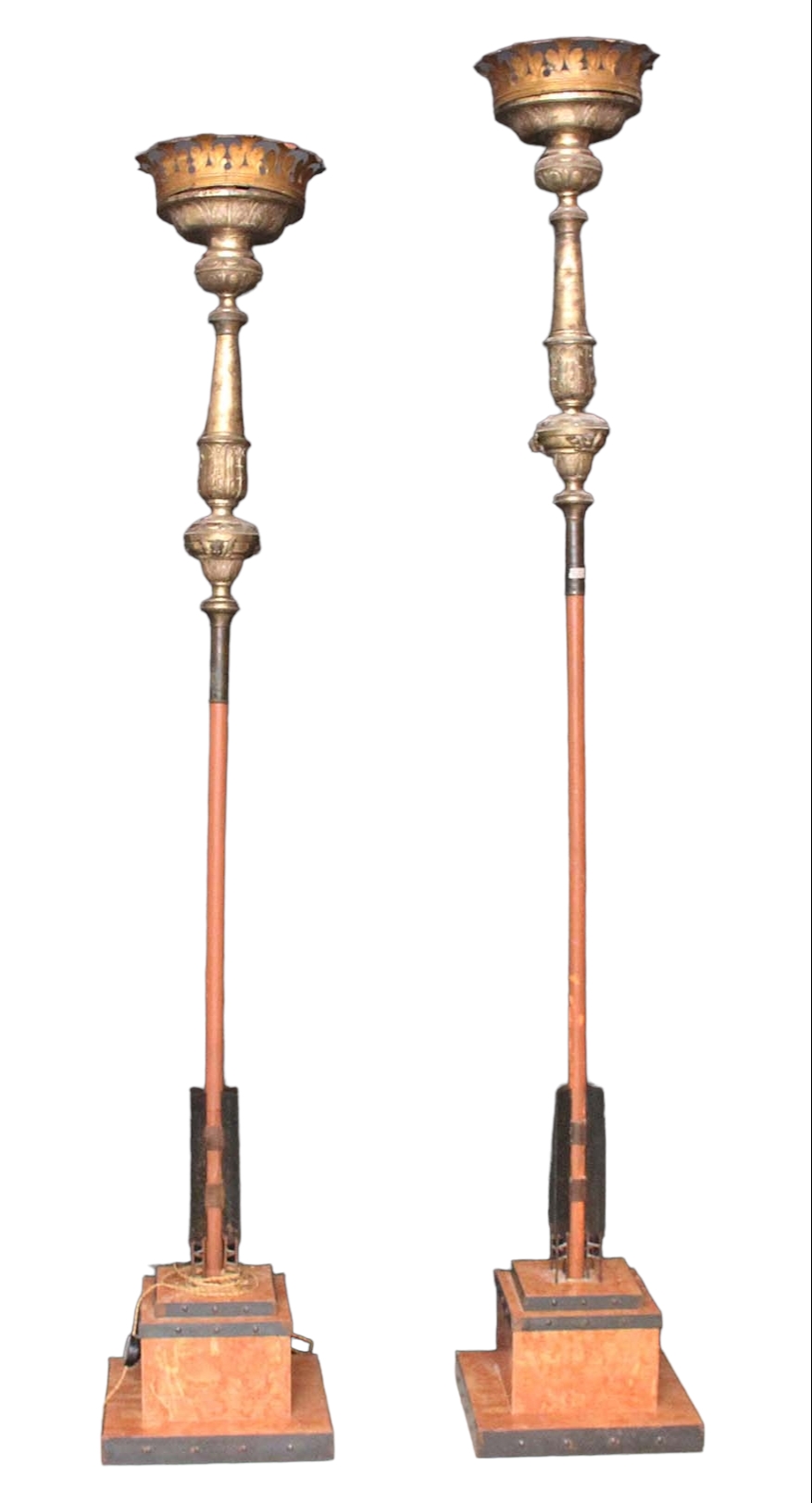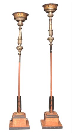 COPPIA DI IMPORTANTI TORCERI in metallo finemente cesellato, argentato e dorato maestranze siciliane, sostenute da basi in marmo rosso di Verona non coeve Sicilia 1680-1730 h cm 247 / h cm 274