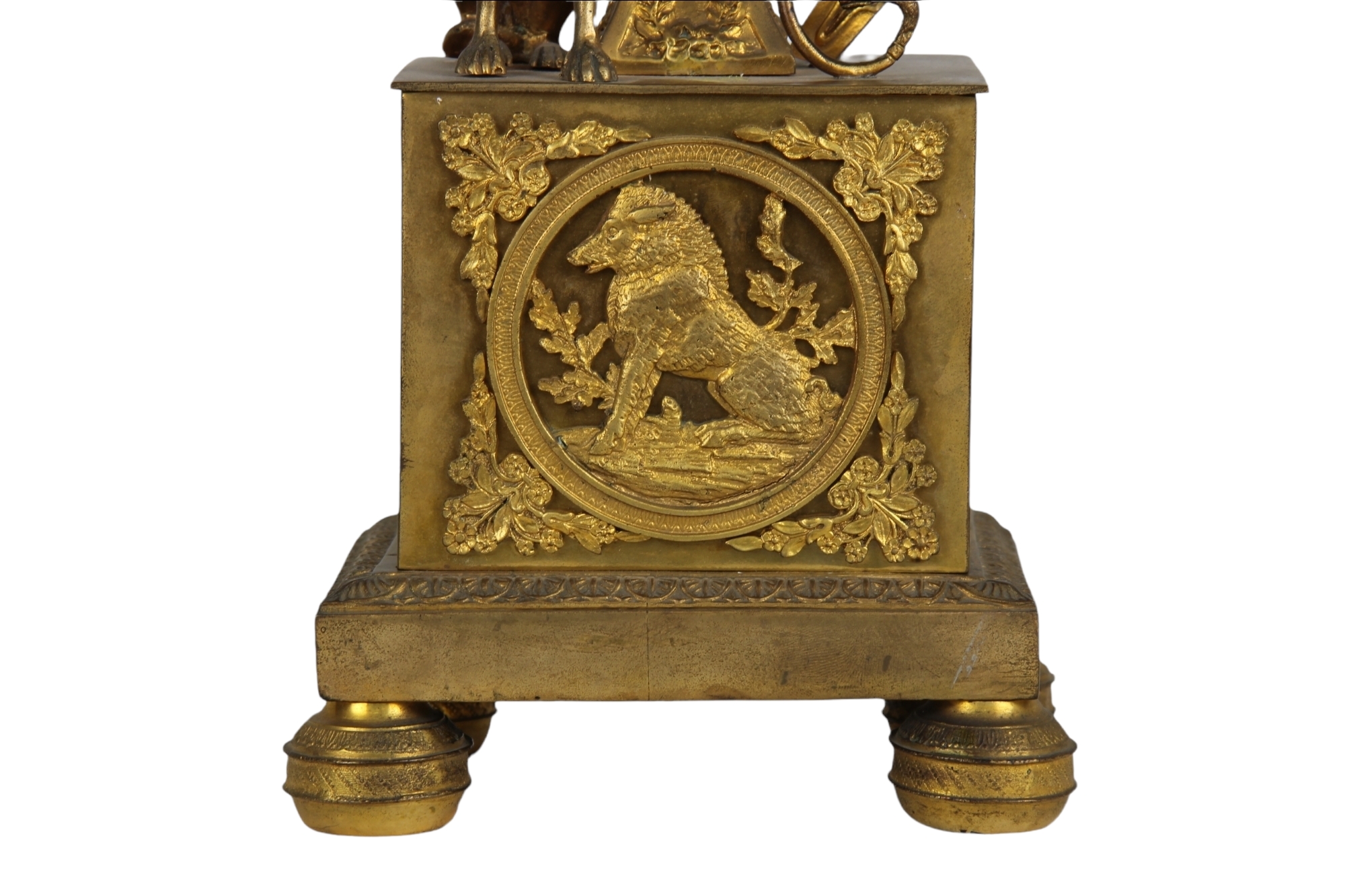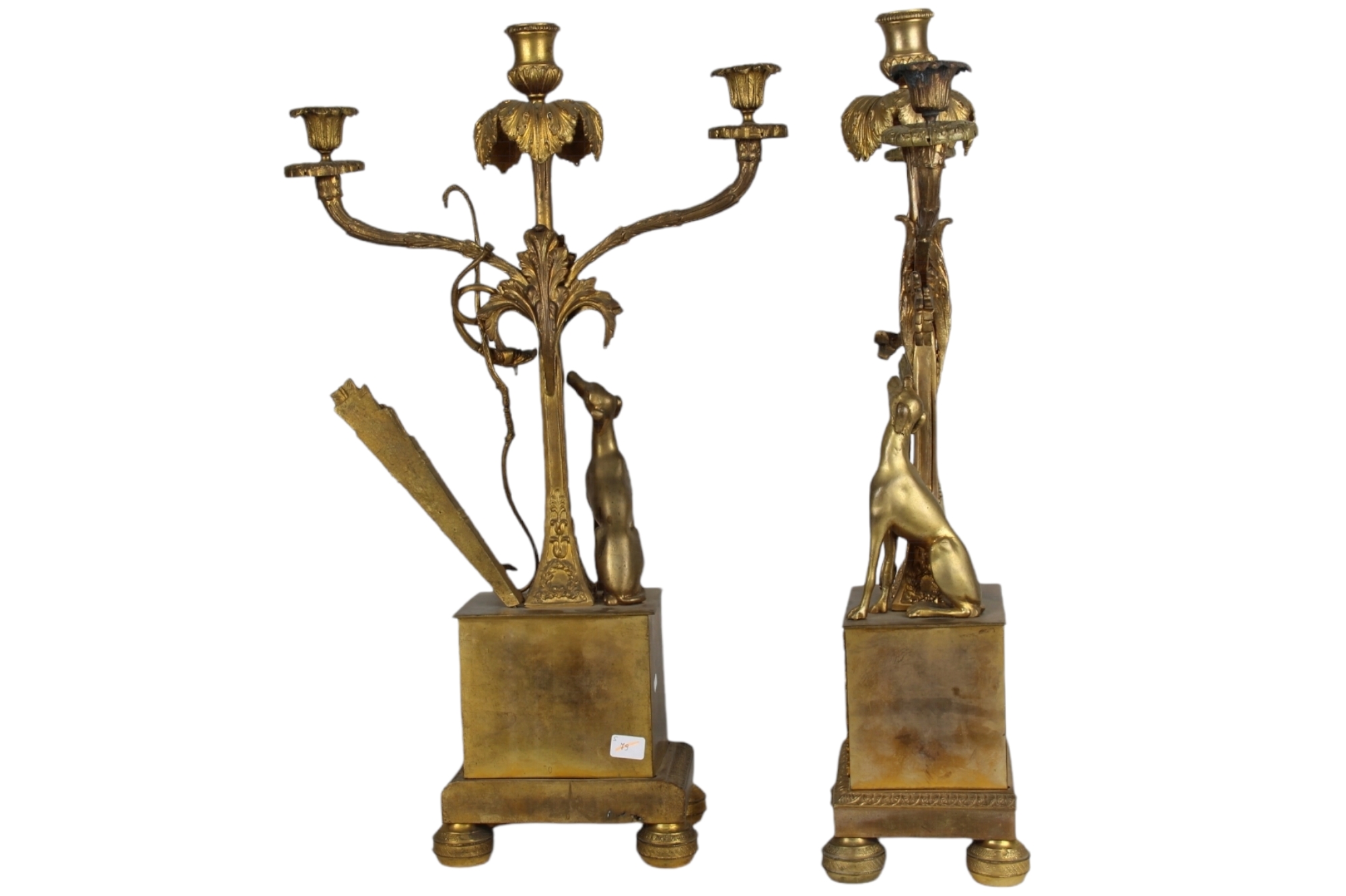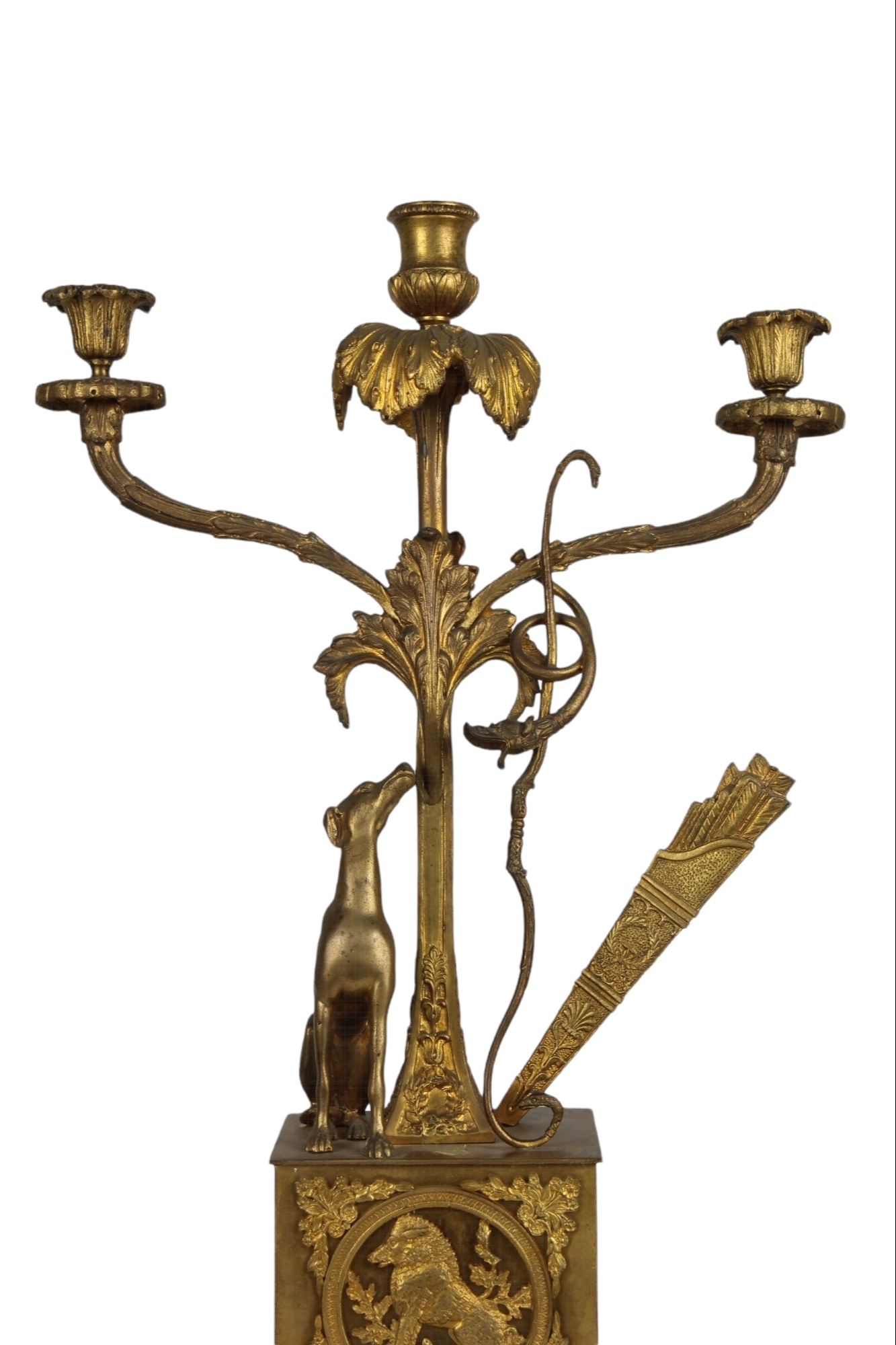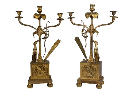 COPPIA CANDELIERI A 3 FIAMME in bronzo finemente cesellato e dorato raffigurante allegoria della caccia Francia XIX secolo h cm 53 x 33 x 13