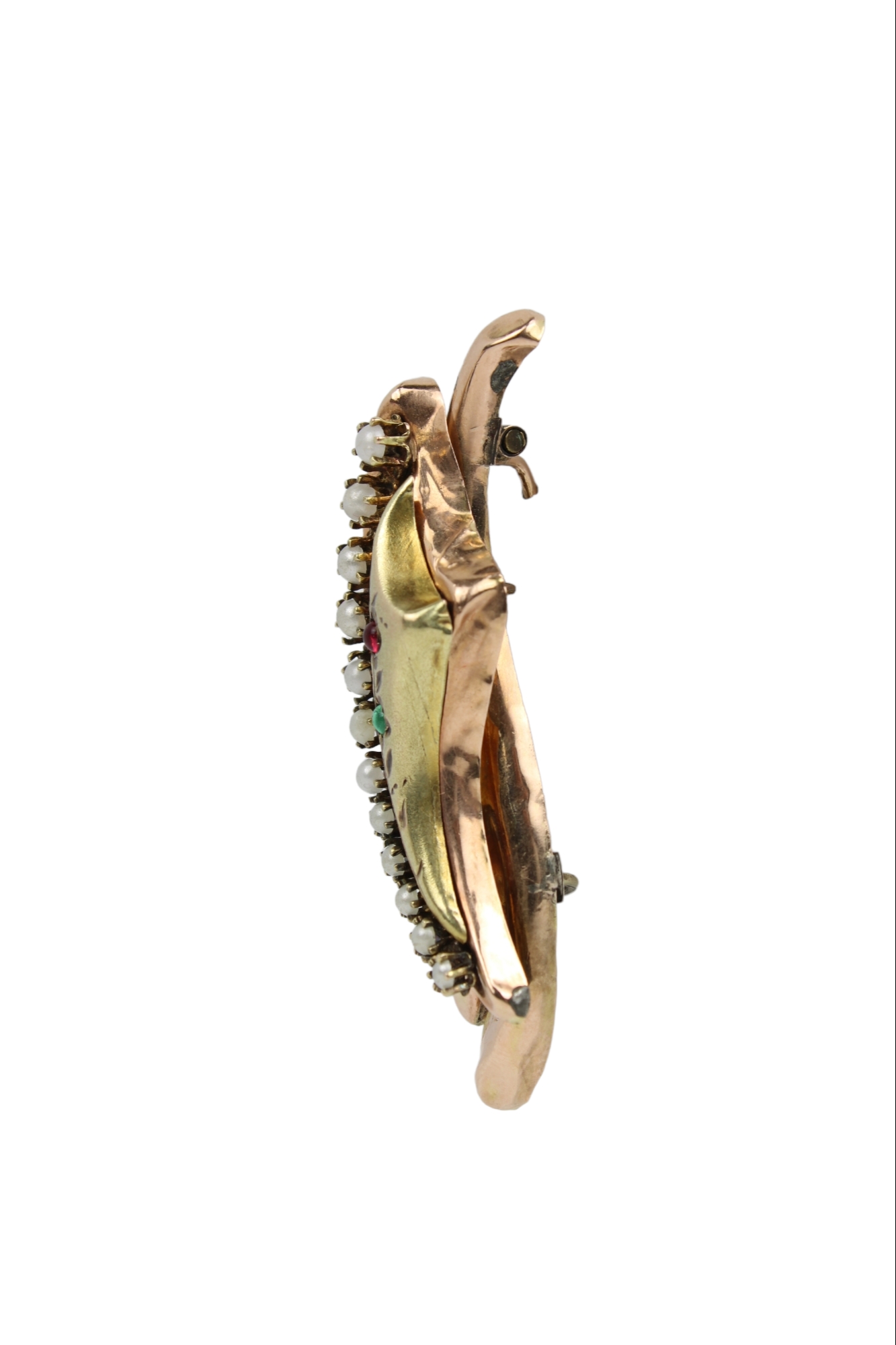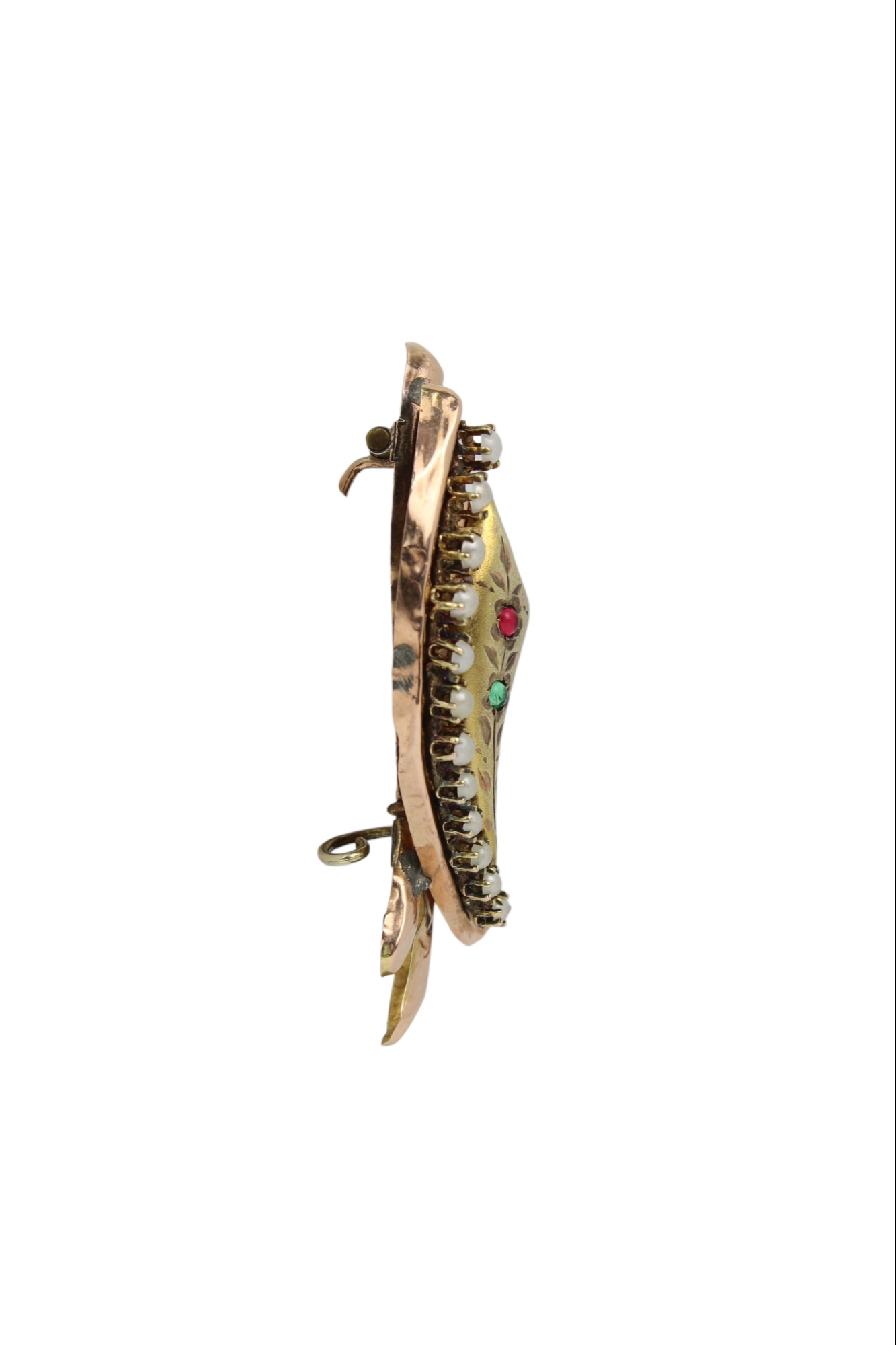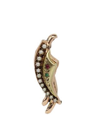 SPILLA BORBONICA in oro basso titolo con perline, smeraldino e rubino, 4,8 grammi
