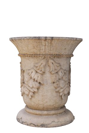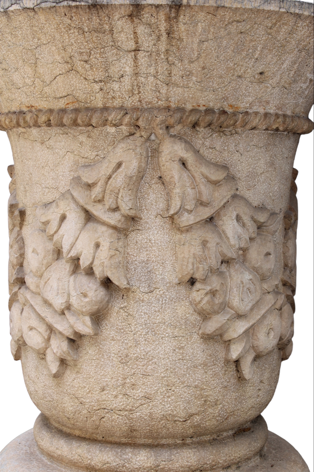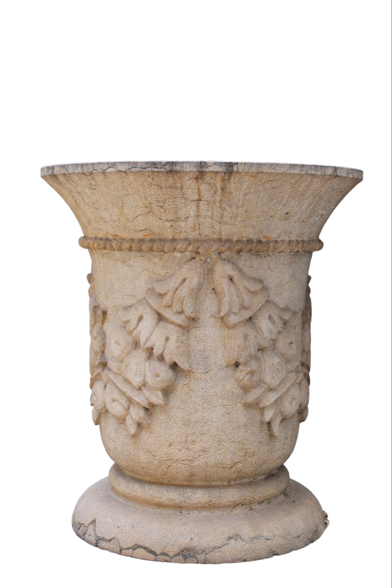 COPPIA VASI in marmo giallo di Verona, scolpiti a bassorilievo manifattura italiana XIX - XX secolo h cm 75 x 67