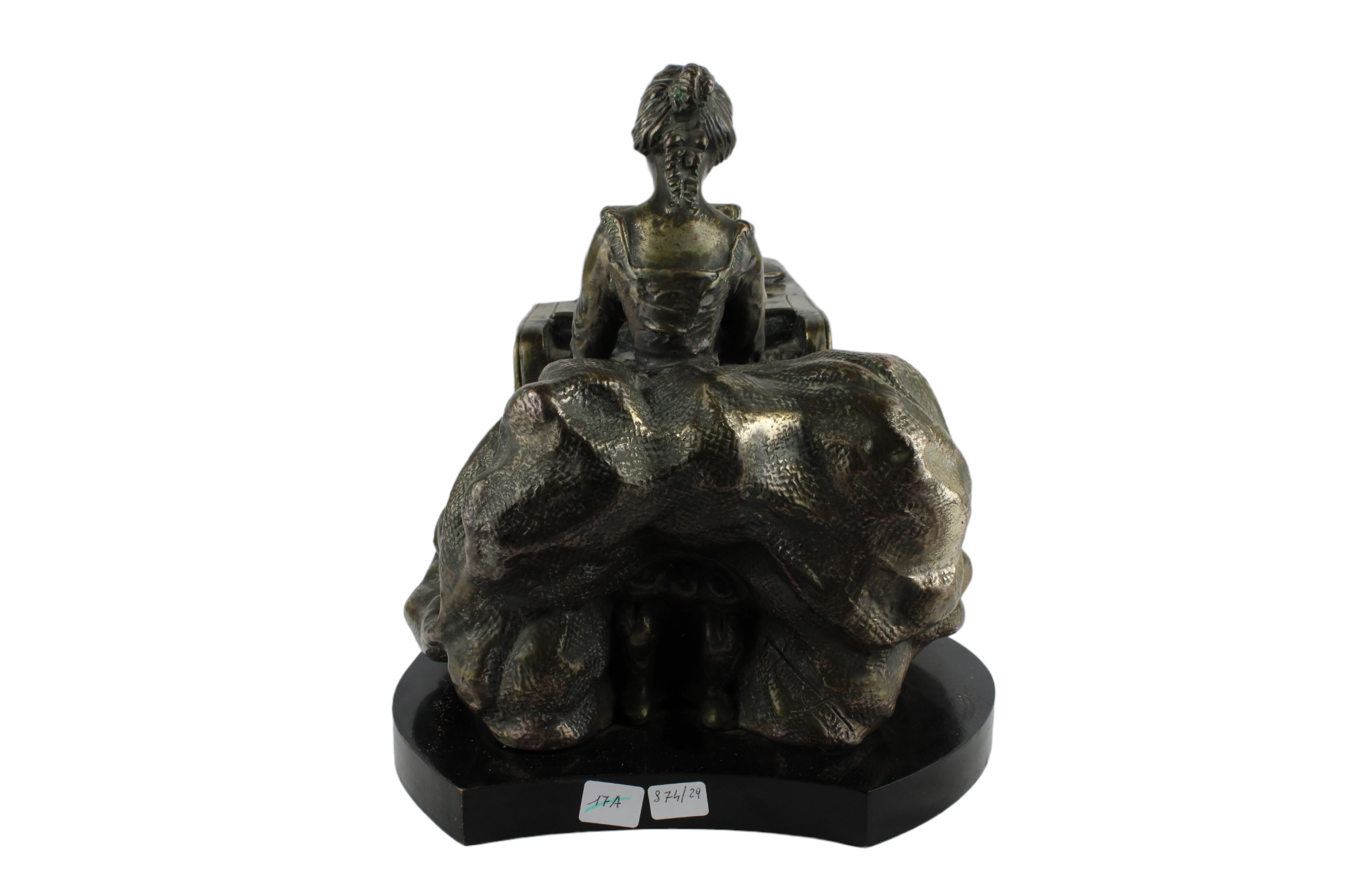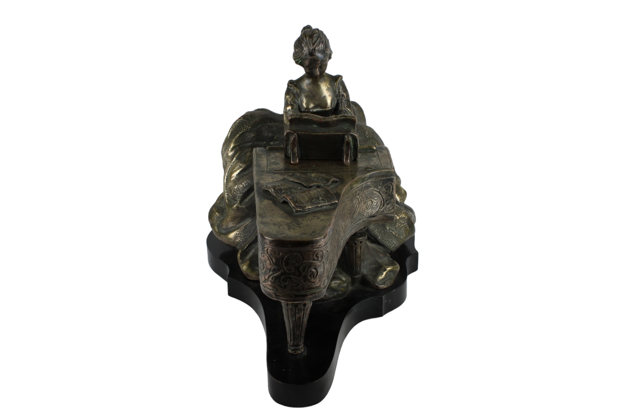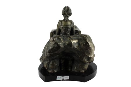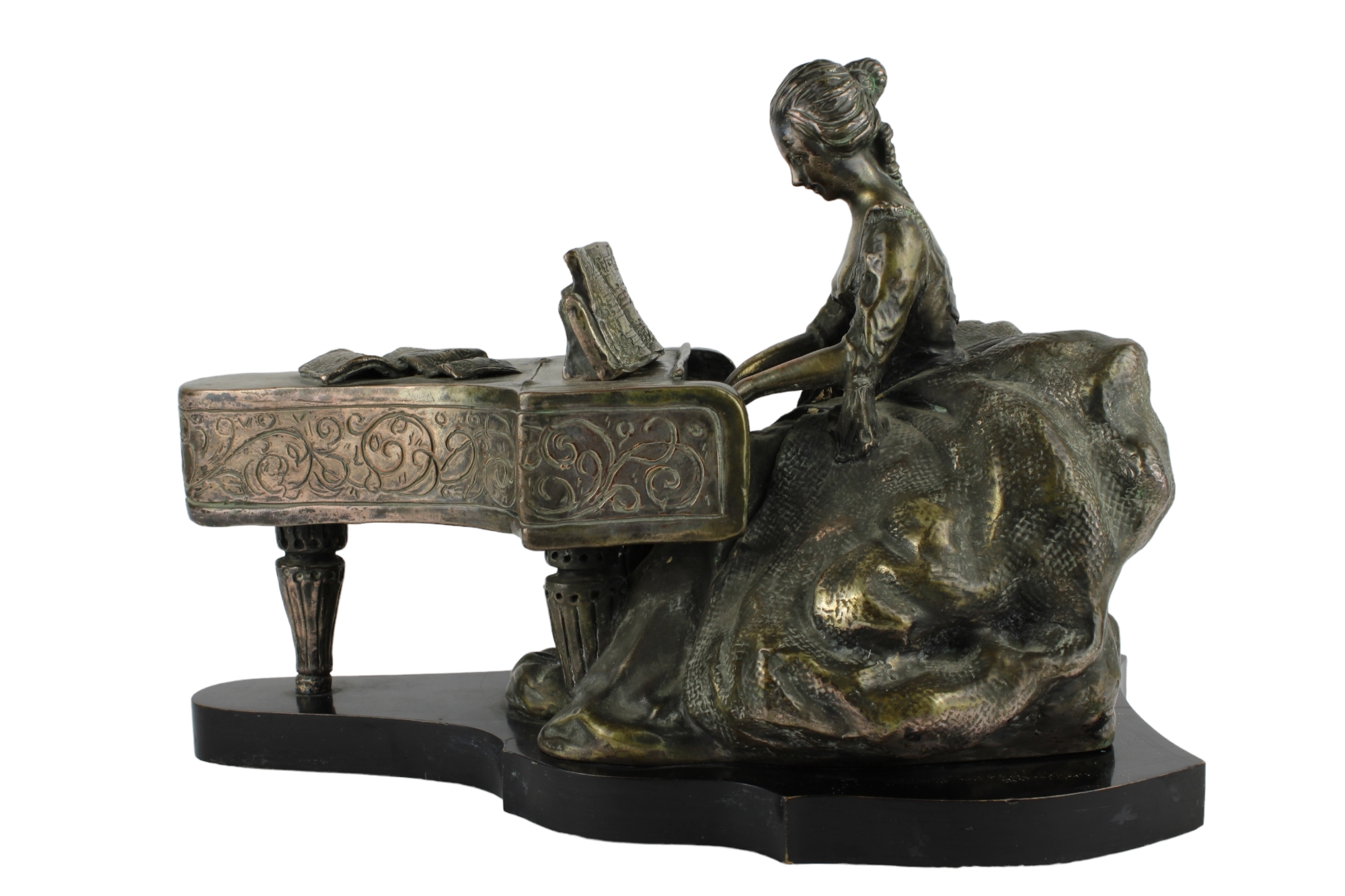 GRUPPO SCULTOREO in metallo patinato raffigurante donna al pianoforte, firmata in basso h cm 30 x 40 x 25