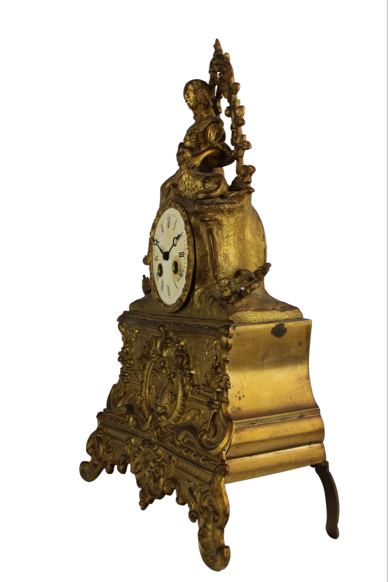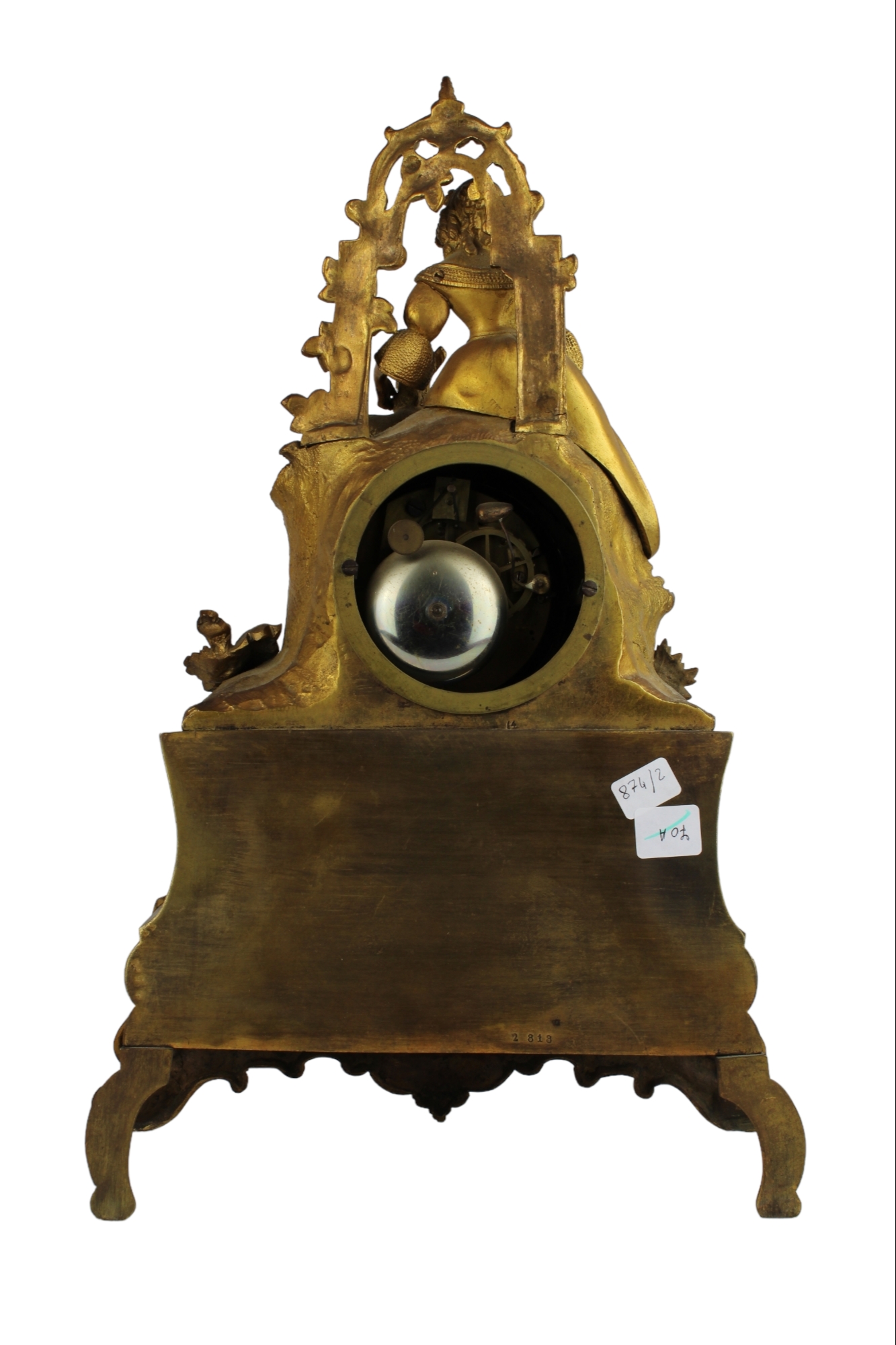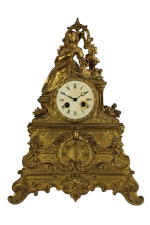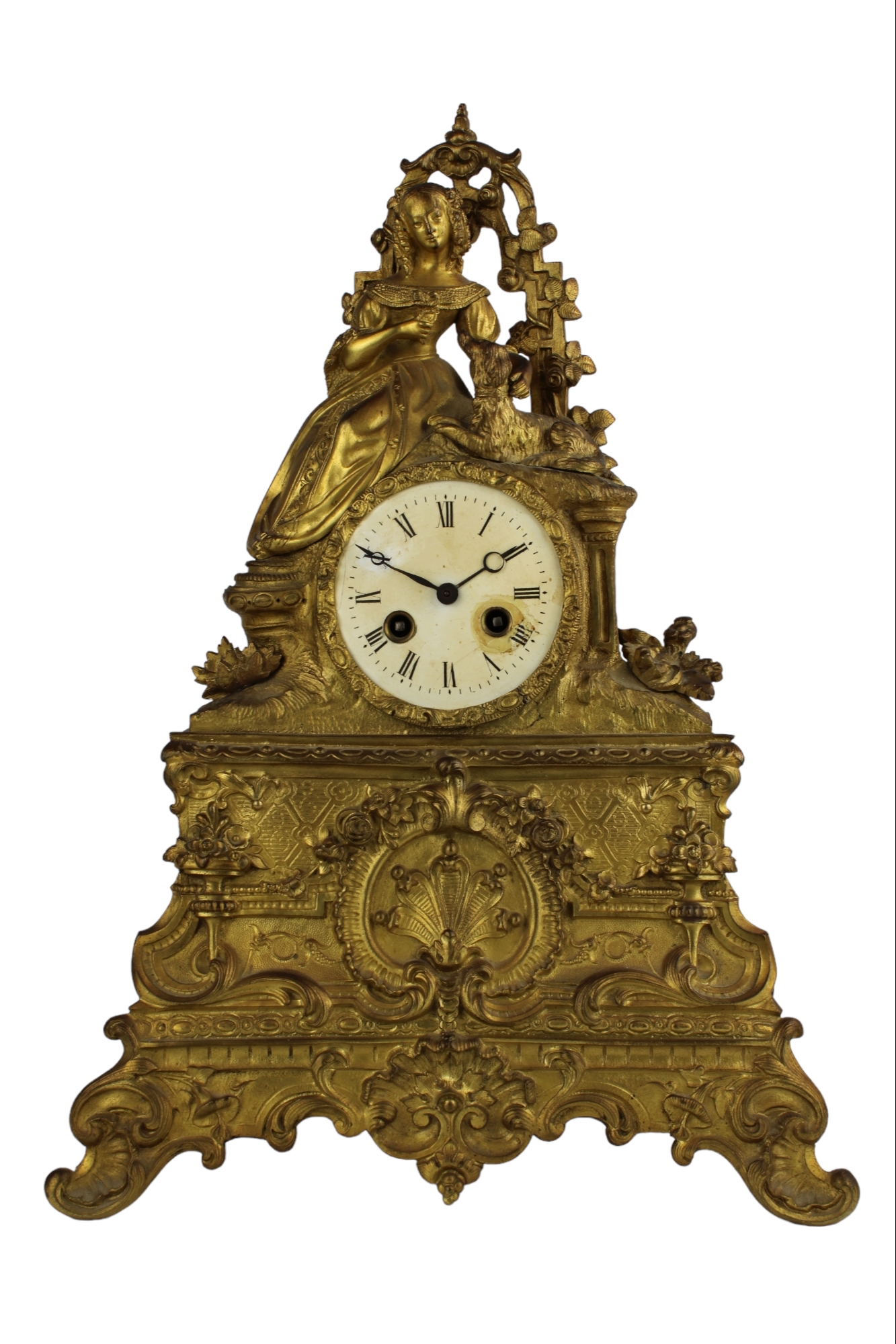 OROLOGIO in bronzo dorato raffigurante dama con cane Francia XIX secolo h cm 40 x 28 x 11