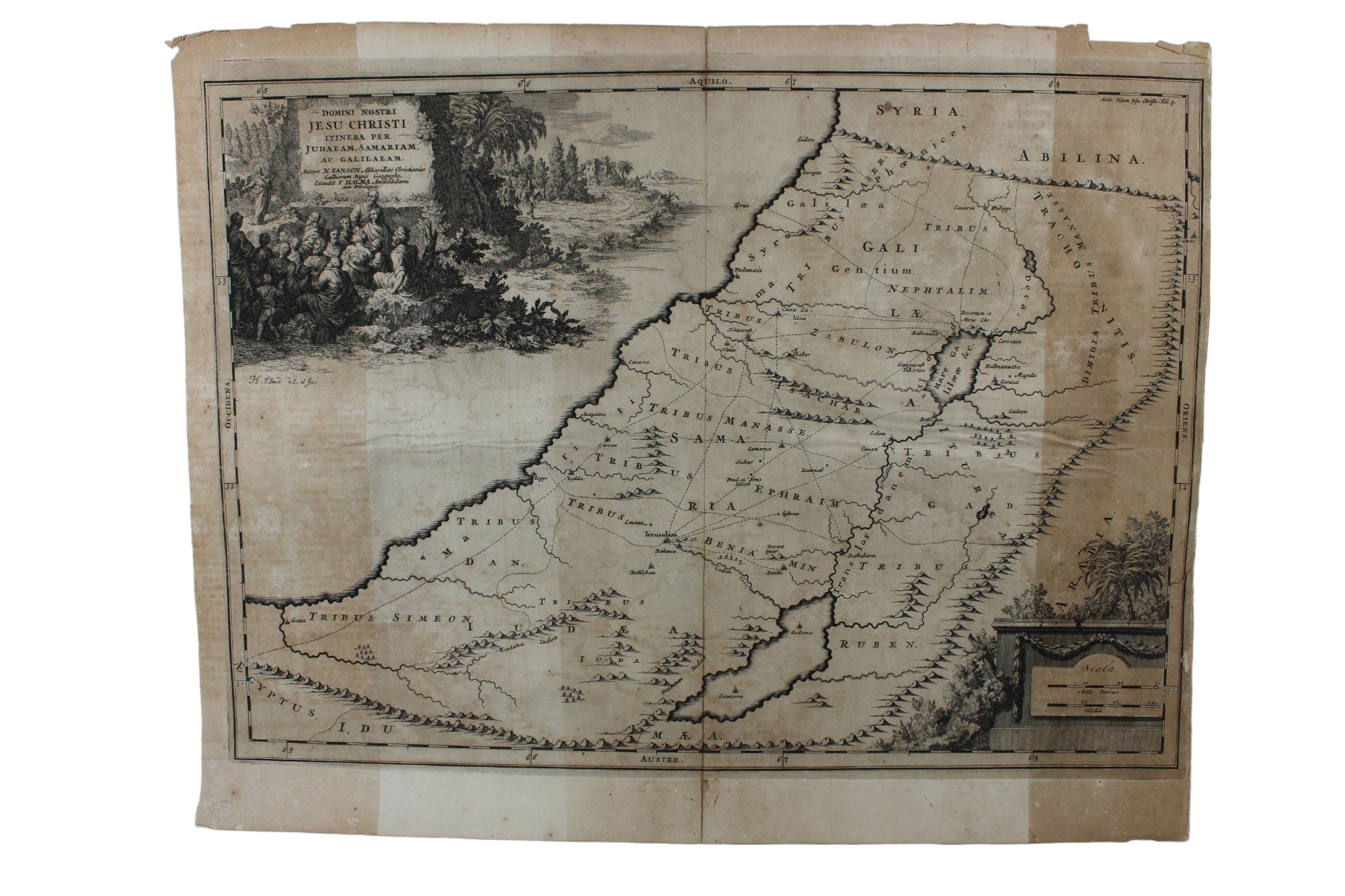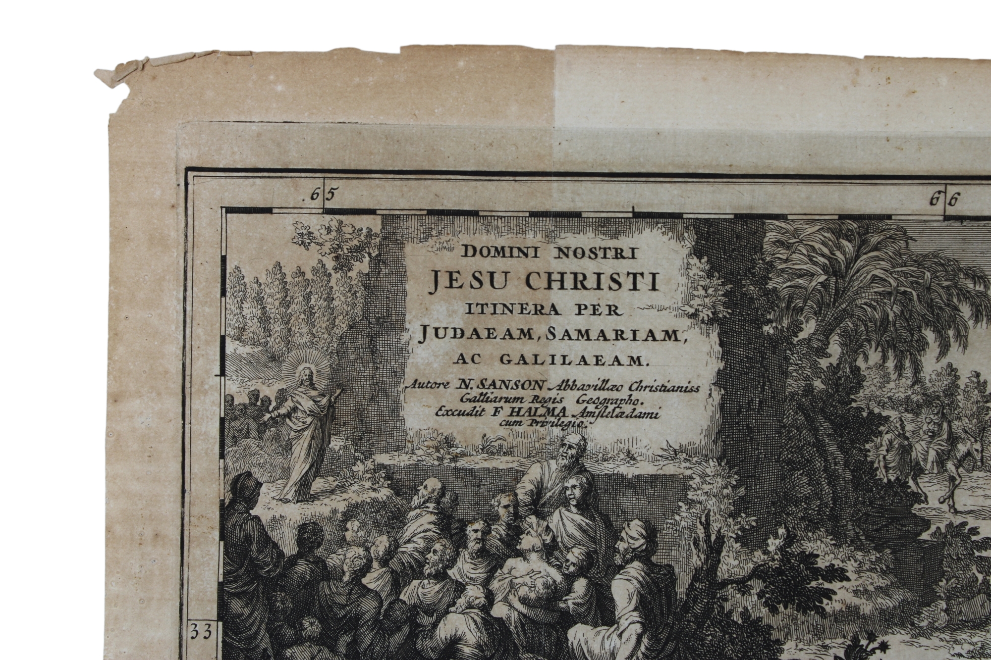 CARTINA GEOGRAFICA SANSON Nicolaus (Abbeville 1600-Parigi 1667)(Palestina) Domini nostri Jesu Cristi itinera per Judaeam Samariam et Galileam. Titolo entro cartiglio riccamente illustrato in cui appaiono i fedeli che ascoltano la parola di Gesu . Carta geografica stampata ad Amsterdam fine sec.XVII. Incisione rame