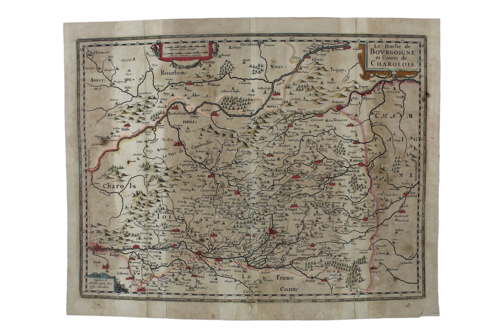 CARTINA GEOGRAFICA LE DUCHE DE BOURGOIGNE ET COMTE DE CHAROLOIS, stampata ad Amsterdam chez Iobe Hondius, Incisione rame