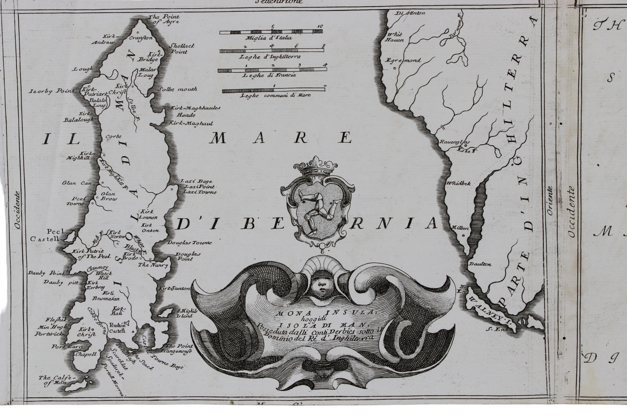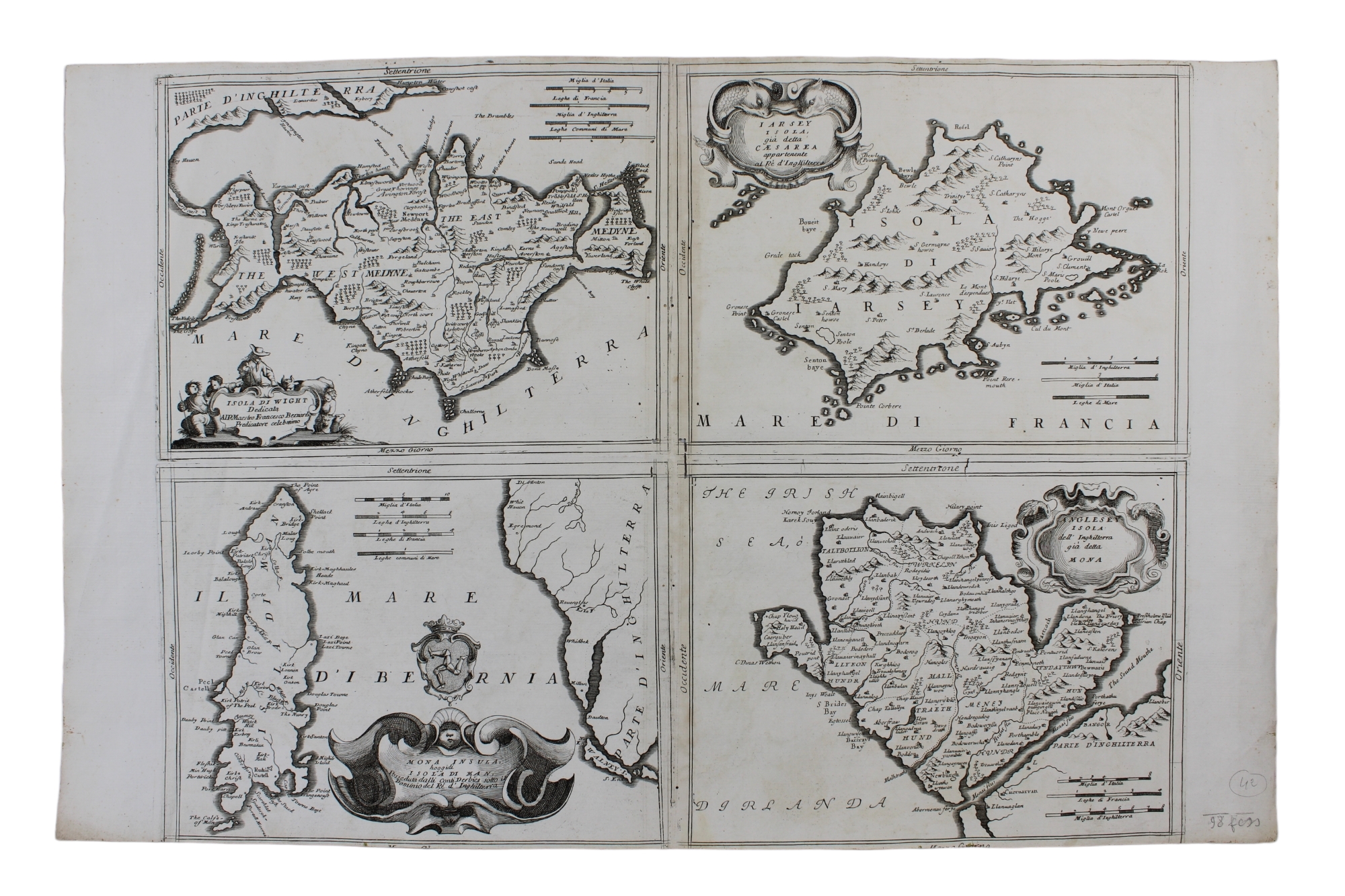 CARTINA GEOGRAFICA CORONELLI Marco Vincenzo ( 1650-1718)(Gran Bretagna)Isola di Wight nome insula hoggidì Isola di Man Jarsey isola gia detta Cesare. Anglesey isola della Inghilterra gia detta Monia. Incisione rame. La carta geografica fa parte de l’atlante :” Corso Geografico Universale“. Venezia (1690-95)