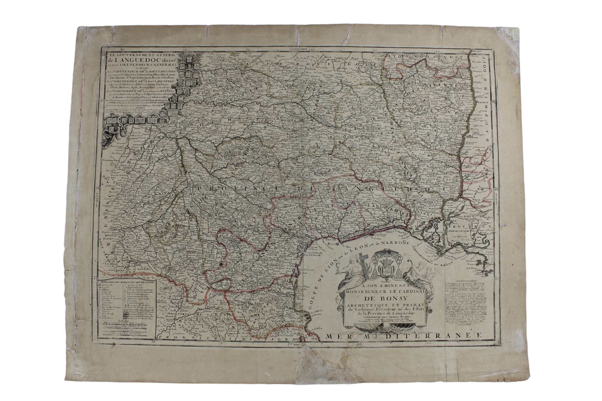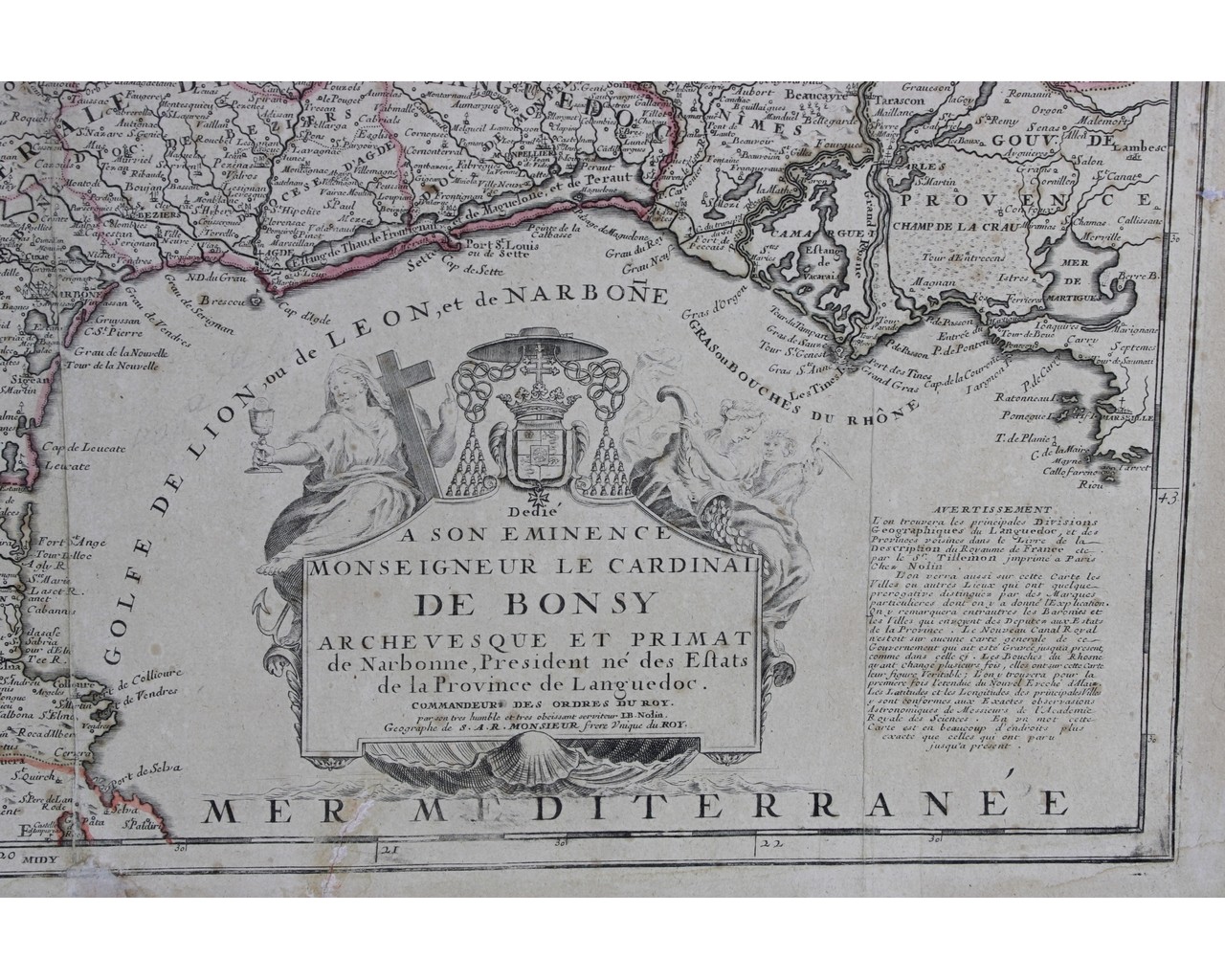 CARTINA GEOGRAFICA NOLIN J.B. (Francia) Le gouvernement general de Languedoc divisée en trois Leutenances generales …de la Catalogne Francoise. Insione rame, stampata a Parigi sec XIX