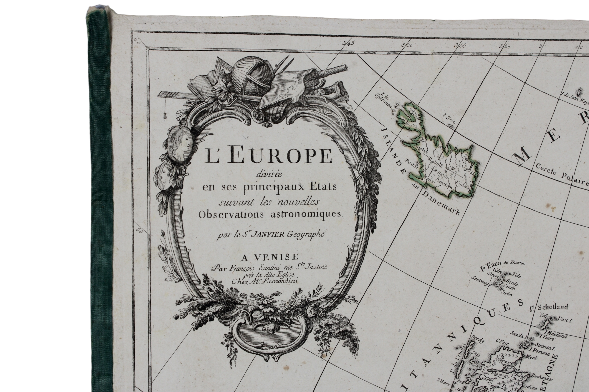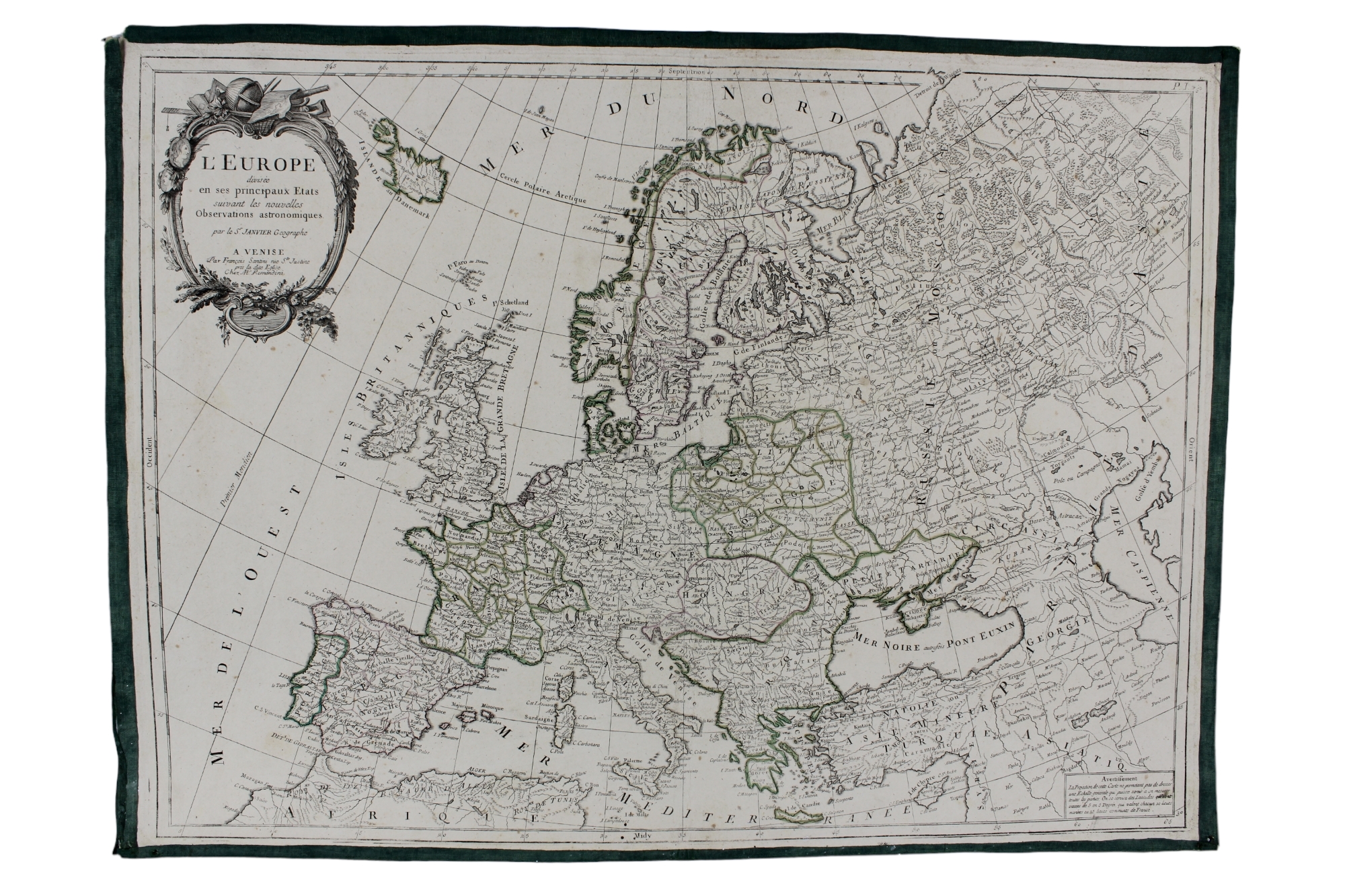 CARTINA GEOGRAFICA REMONDINI Giuseppe Antonio (nato 1634) Europa. L'Europe divisée en ses princioaux Etats souvans les nouvelles observations… par Sr. Janvier geographe. Inc. rame stampata a Venezia chez Remondini sec XVIII Carta geografica controfondata posteriormente da tela di lino (epoca 1800)