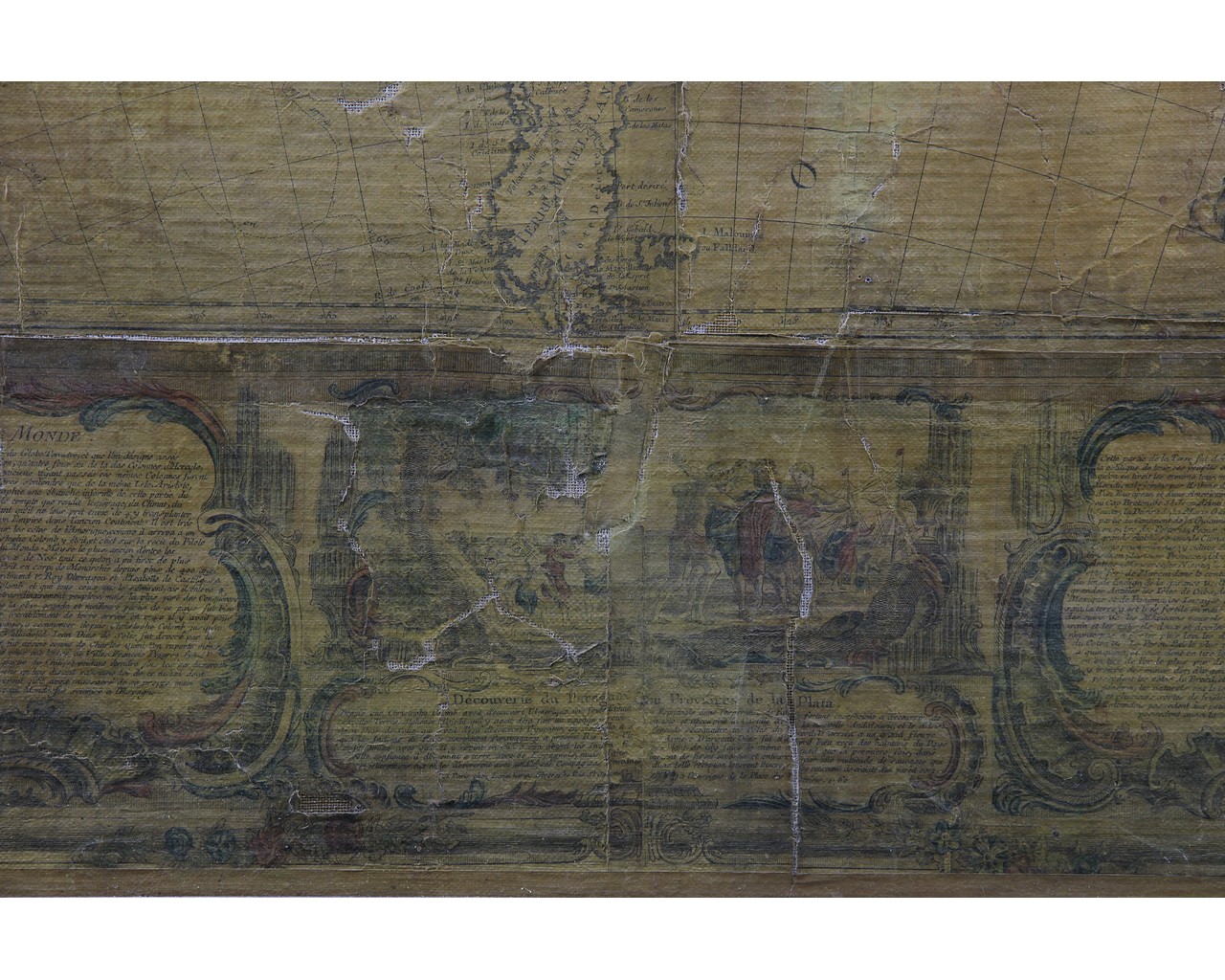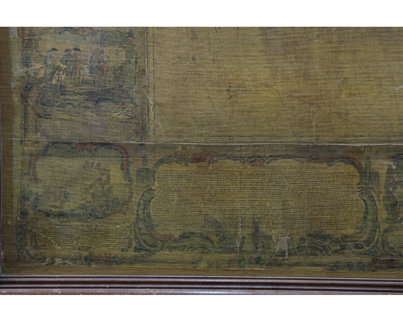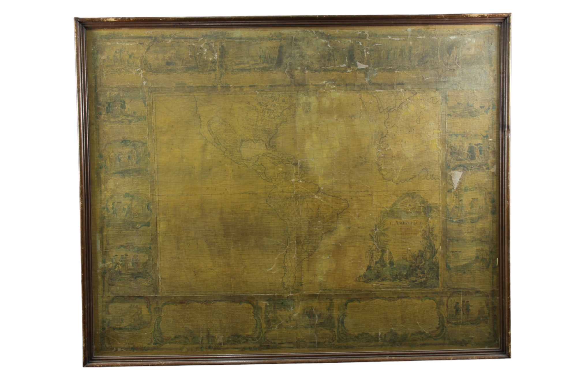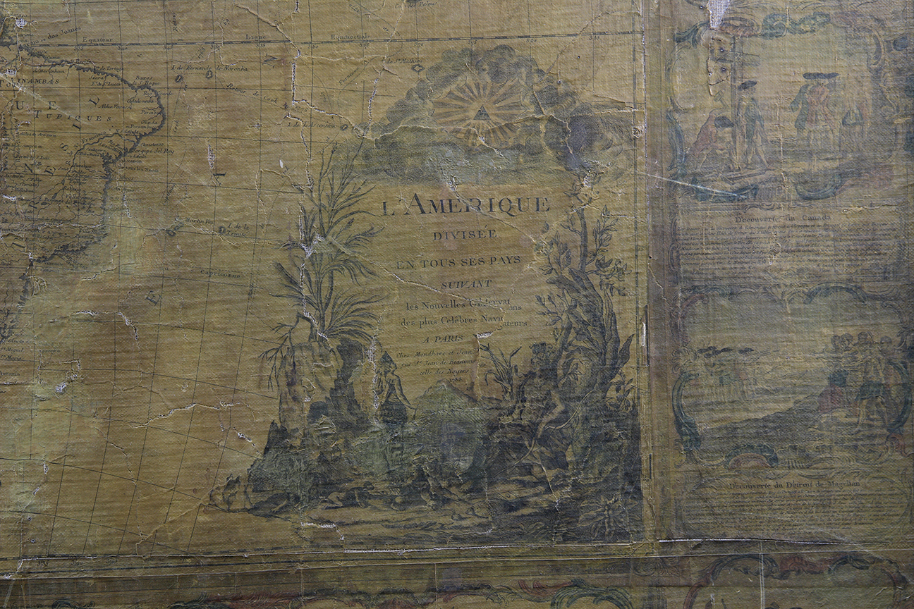 IMPORTANTE CARTINA GEOGRAFICA SU CARTA APPLICATA SUTELA Raffigurante L'America e scene di vita, reca scritta Parigi 1788 già collezione Pietro Accorsi, mancanze e usure del tempo h cm 120 x 150
