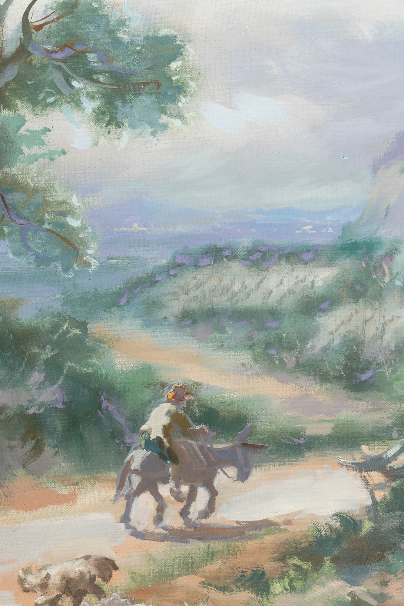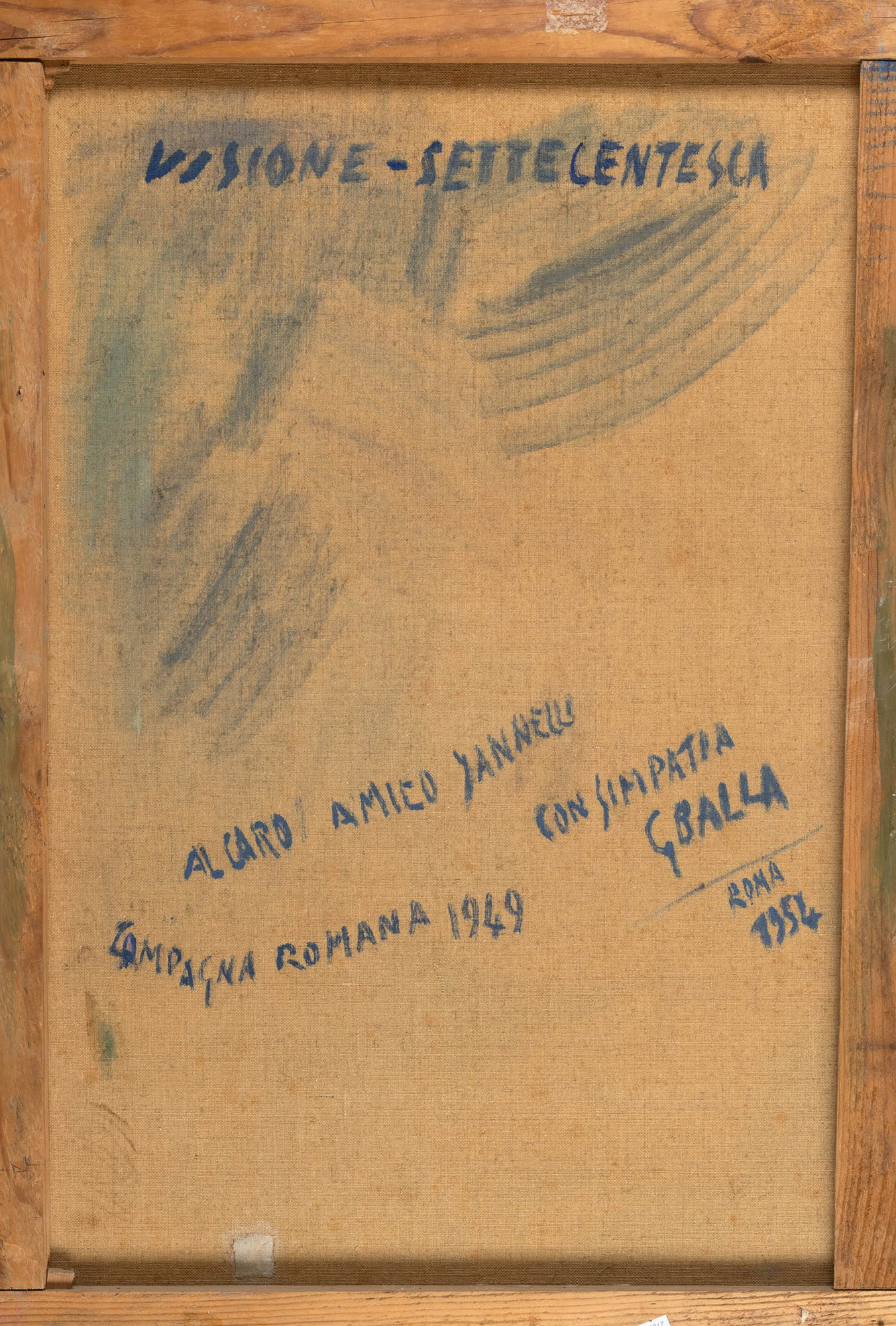 Già a inizio secolo, quando arriva a Roma, è forte in Giacomo Balla l’interesse per la natura: Mi alimento della purezza buonissima della natura. Animali, piante, mari, monti, cielo, terra, stagioni, paesi, climi freddi e calori, giorni allegri e tristi ecc. tutto insomma diventa arte – NUOVA – immutabile, si legge sempre in un taccuino di inizio Novecento. L’olio, datato e intitolato sul retro Visione Settecentesca, Campagna romana 1949, viene regalato al caro unico Pannelli nel 1954. Il caro amico è l’ambasciatore Pasquale Jannelli (Castroreale 1889— Roma 1965), ritratto da Balla in abito da Ambasciatore nel 1935 e fratello di Guglielmo Jannelli (1895-1950), anche lui ritratto da Balla nel 1937. Internato nei campi di concentramento dal 1943 al 1945, come Ambasciatore copre diversi incarichi in giro per il mondo e nel 1953 diventa Grande Ufficiale del1’Ordine al Merito della Repubblica. Scrive Sapori: “Dei ritratti virili il più recente credo sia quello del diplomatico Jannelli. Il tipo bruno e forte pianta e si spicca con la forza corroborante della giovinezza. Invece di esserne danneggiato, si giova della ricca assisa dall’alto colletto rosso solferino, delle decorazioni squillanti, della feluca orlata di piume di struzzo, poggiata tra le mani insieme ai guanti candidi. allo spadino con l’elsa d’ora cesellato e di madreperla. Il fondo del dipinto reca una carta geografica della Sicilia nativa e una fotografia del Duce. Anche qui si avverte la voluttà dell’artista che soppesa e controlla ogni pennellata, per ottenere una fluidità che piomba, l’asprigno di certi particolari. qualcosa di cristallino e arioso a un tempo, come si trova ne’ suoi paesaggi, ricchi d’aerea prospettiva e animati di sostanziosa ampiezza” (in “Il resto del Camino”, Bologna 1 marzo 1938). La stretta amicizia della famiglia Balla con i fratelli Jannelli viene ricordata più di una volta anche da Elica Balla nel 1984 e nel 1986: nel 1914, Balla scrive a Guglielmo in Sicilia ringraziandolo degli “aranci sono stati eccccccelllllllenti, grazie” e lo saluta “Avanti dunque elettricamente tuo Balla”. Nella lettera del giugno 1943. l’Aff. Guglielmo richiamato alle armi a Messina, scrive: "Il ritratto di Pasqualino messo in salvo e trasportato dal Comm. Fiore a Castroreale”., (dal testo di archiviazione della Dott. Elena Gigli)