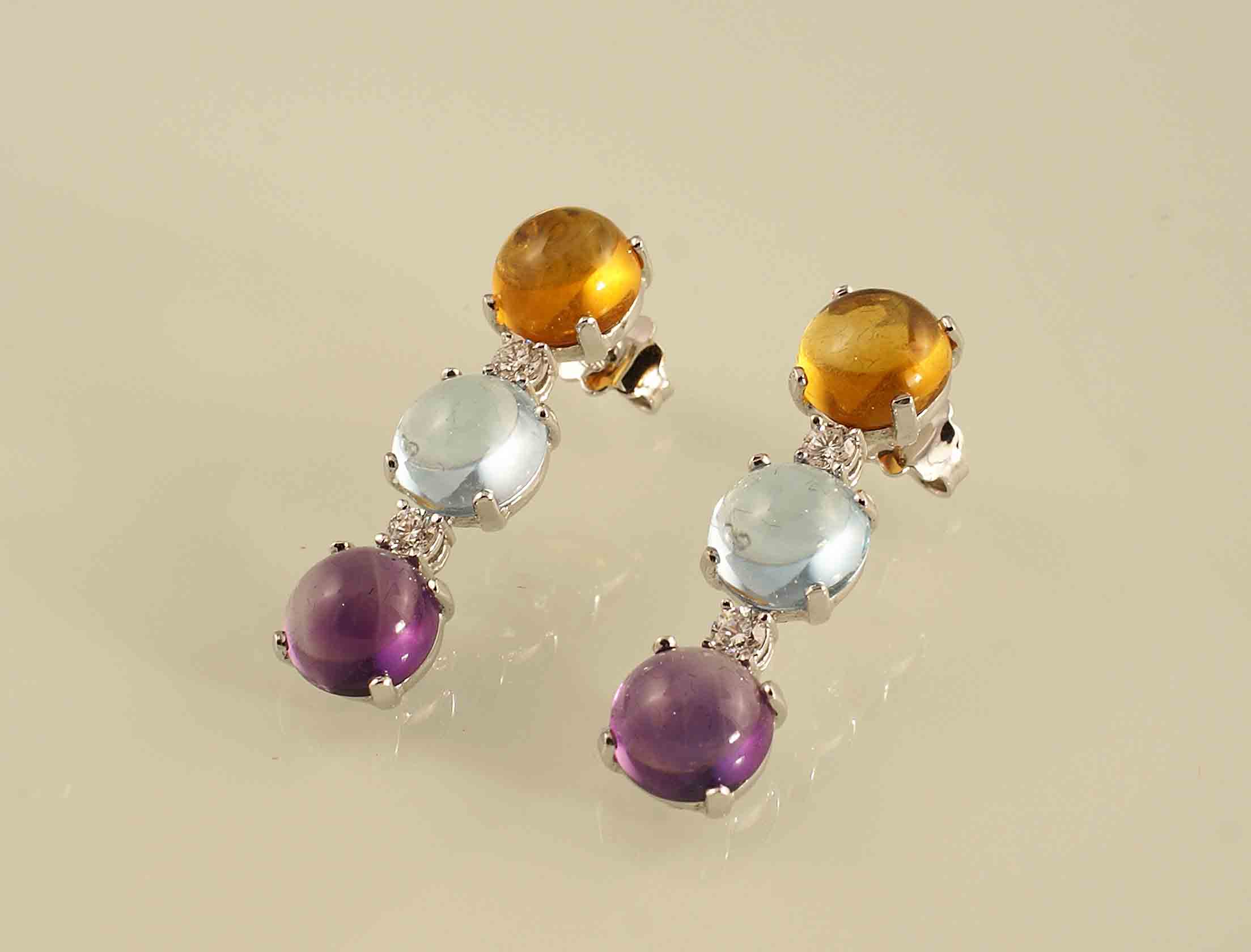 Orecchini pendenti in oro bianco 18kt con incastonate tre tormaline cabochon di diverso colore alternate a quattro diamanti taglio brillante per 0,35 punti circa, gr. 10,9.