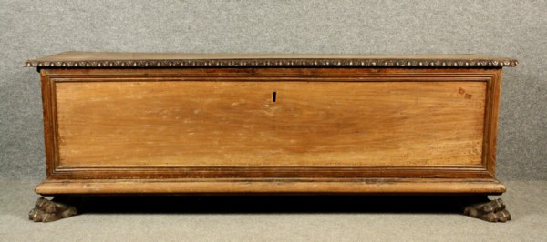 Firmato, datato. Cassapanca in noce. XVII secolo. Piedi di epoca posteriore. Mis. Lung. cm. 158 Alt. cm. 53 Prof. cm. 50 ca.