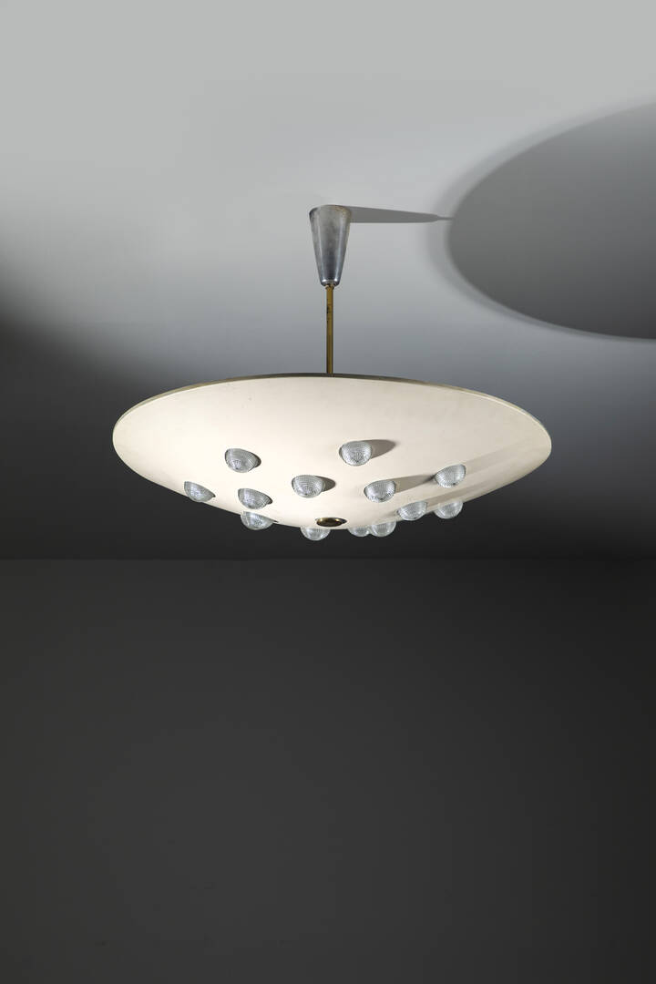 Struttura in metallo verniciato, elementi diffusori in vetro, particolari in ottone.
