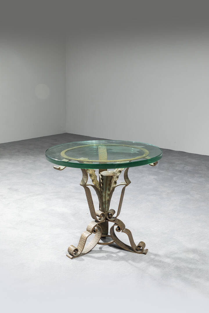 Base in ferro battuto e piano in vetro.