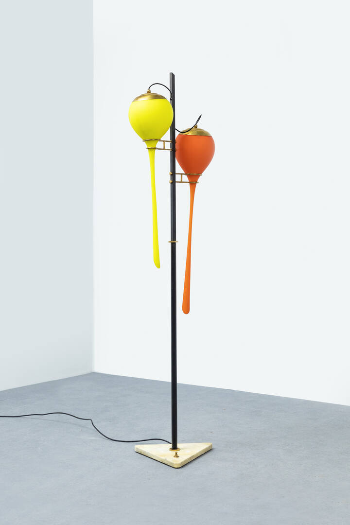 Lampada da terra con stelo in metallo verniciato, diffusori in vetro satinato colorato, particolari in ottone, base in marmo.