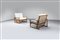 Coppia di poltrone con struttura in bamboo, legature in cuoio, particolari in ottone, cuscini rivestiti in tessuto.