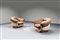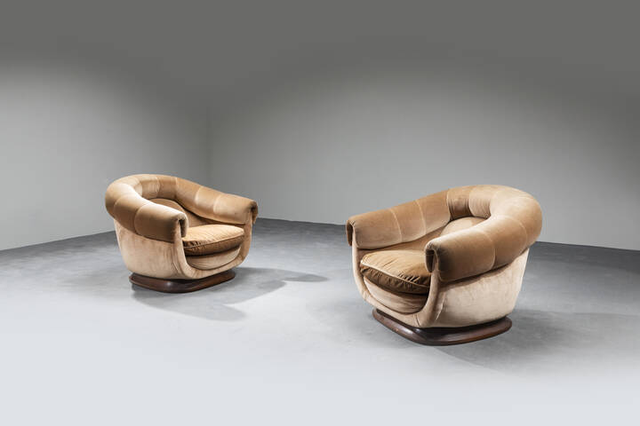 Coppia di poltrone con basamento in legno, imbottitura rivestita in velluto.