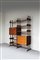 Libreria modulare a due campate in legno, particolari in metallo verniciato e ottone.