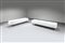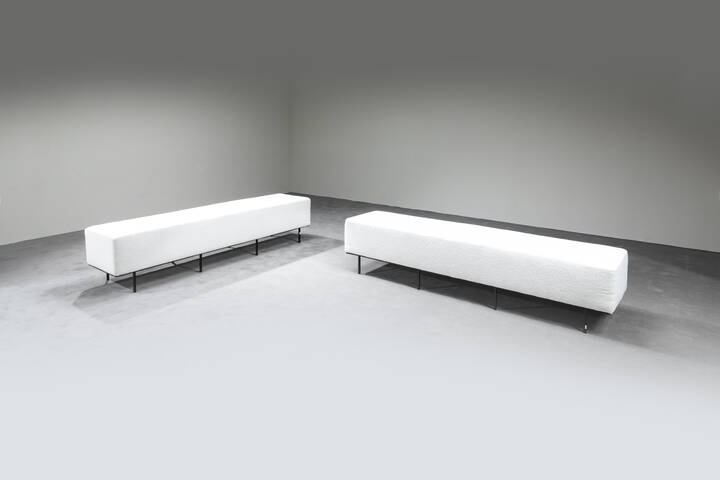 Coppia di grandi panche con imbottitura rivestita in tessuto e sostegni in metallo verniciato.