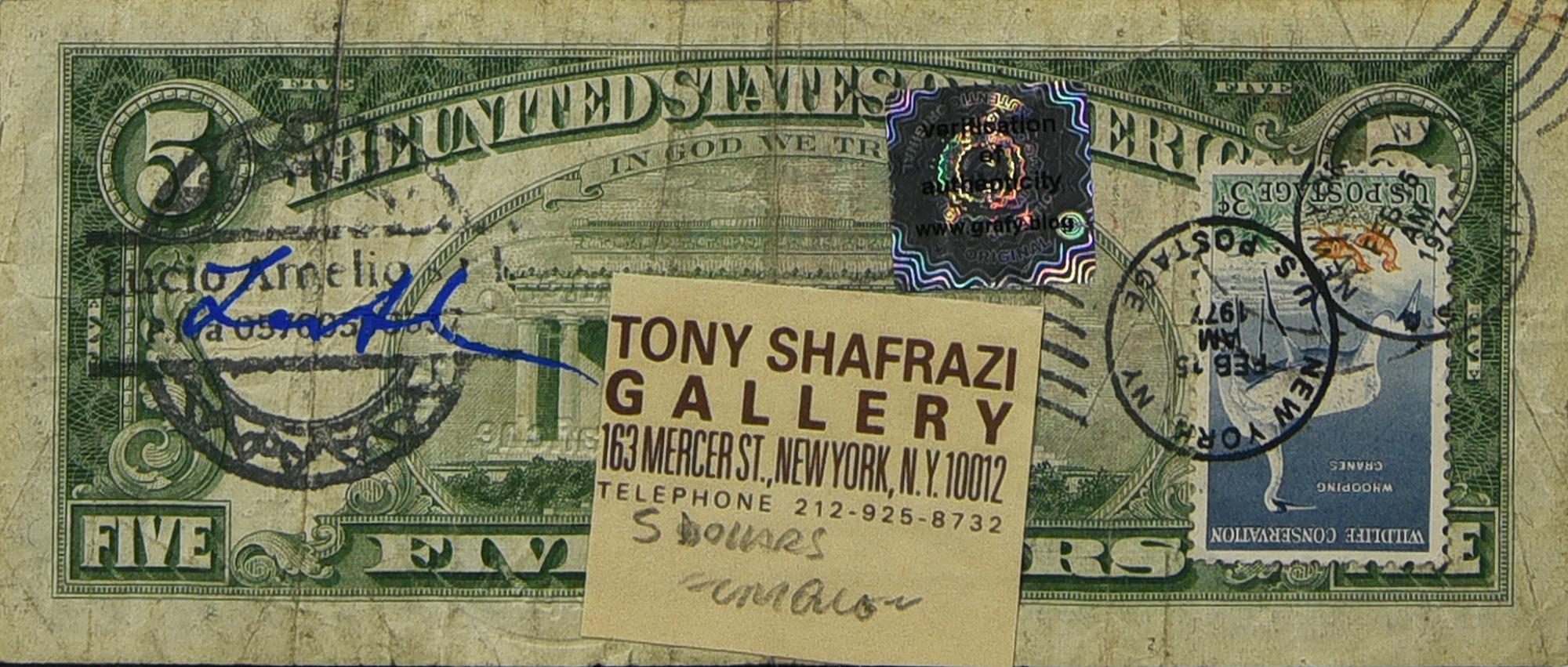 sul retro: timbro Lucio Amelio, etichetta Tony Shafrazi Gallery, francobollo e timbro postale americano del 1977