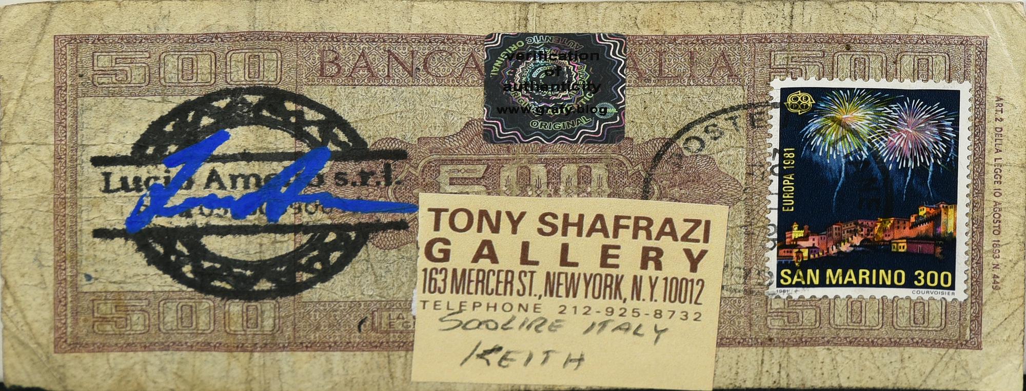 sul retro: timbro Lucio Amelio, etichetta Tony Shafrazi, francobollo e timbro postale di San Marino del 1981