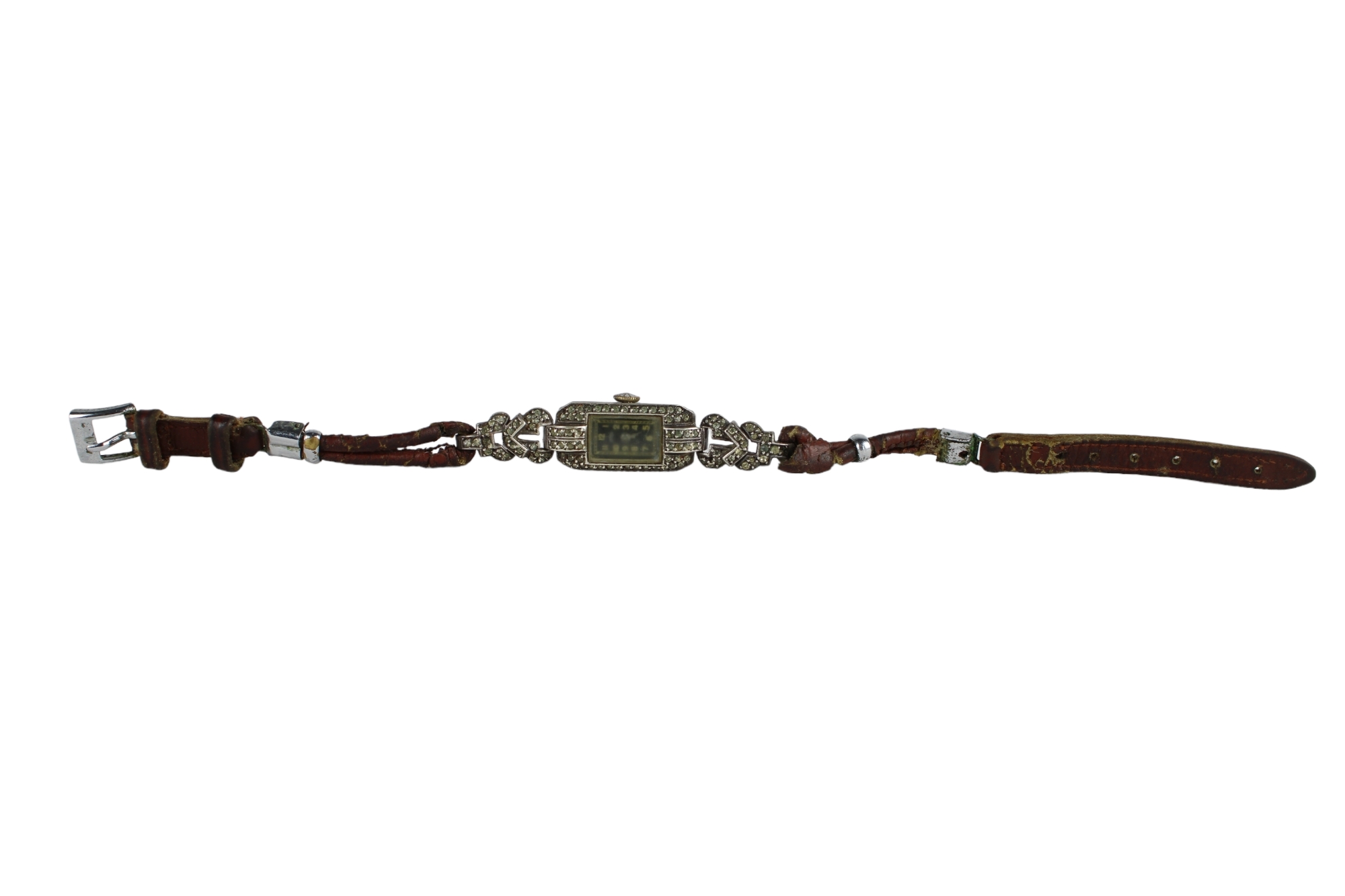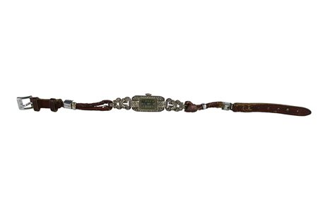 Precedente Lotto 553 Successivo Trionfante Antiques - VIA ALTOFONTE 82, 90129 PALERMO ASTA DI ANTIQUARIATO VINTAGE E COLLEZIONISMO II ASTA ANTIQUARIATO VINTAGE E COLLEZIONISMO II venerdì 7 luglio 2023 ore 20:30 (UTC +01:00) OROLOGIO DONNA DA POLSO non funzionante anni 30 h cm 22 x 1,5