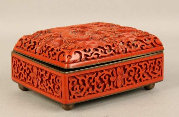 Firmato, datato. Scatoletta in lacca rossa lavorata in altorilievo e smalto. Cina. Fine XIX secolo. Mis. Lung. cm. 10,5 Alt. cm. 5 Prof. cm. 8,5 ca.