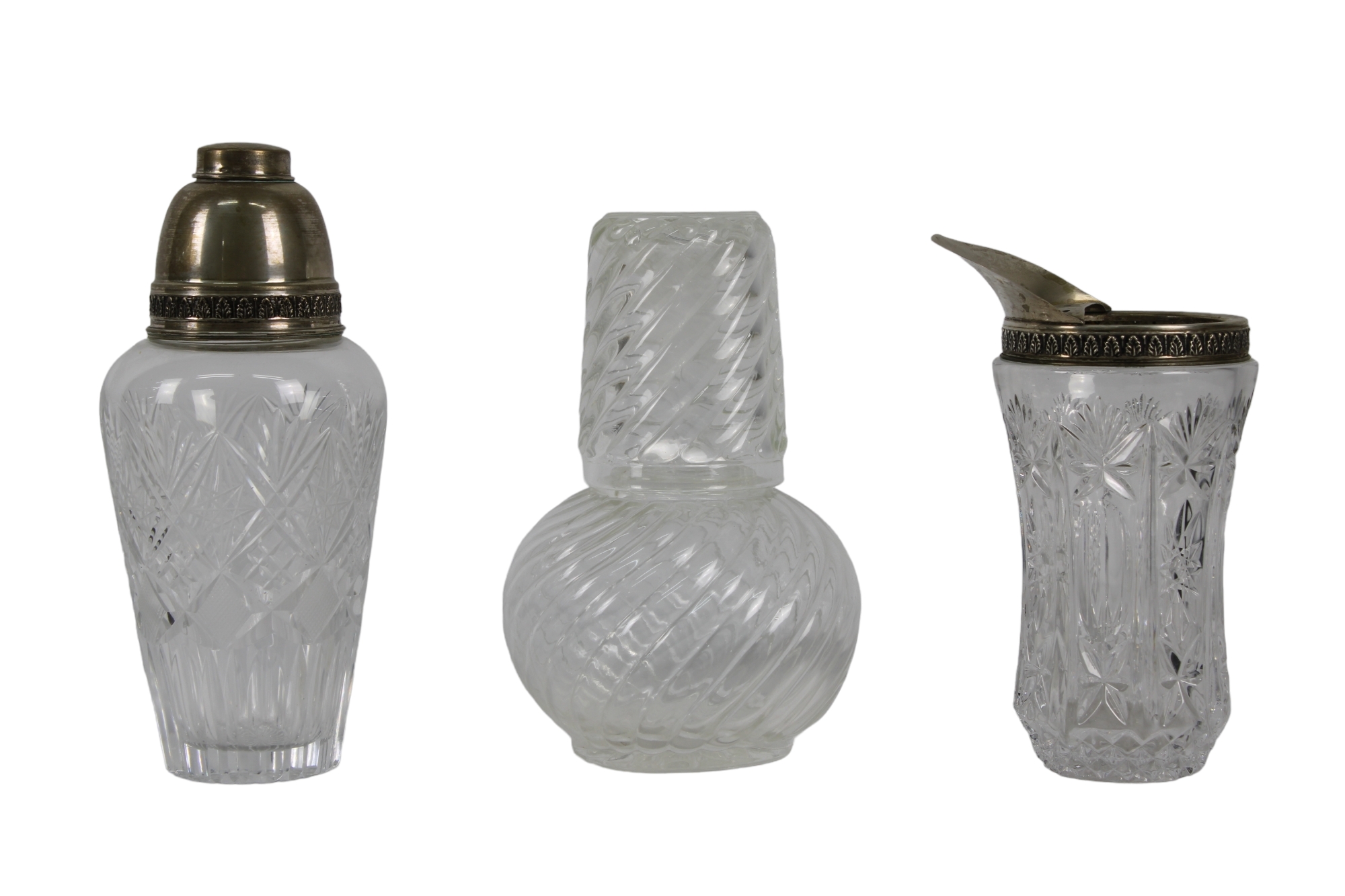 1 bottiglia da notte con bicchiere, 1 shaker e 1 versatoio in vetro intagliato e argento h cm 22 / h cm 20 / h cm 18,5