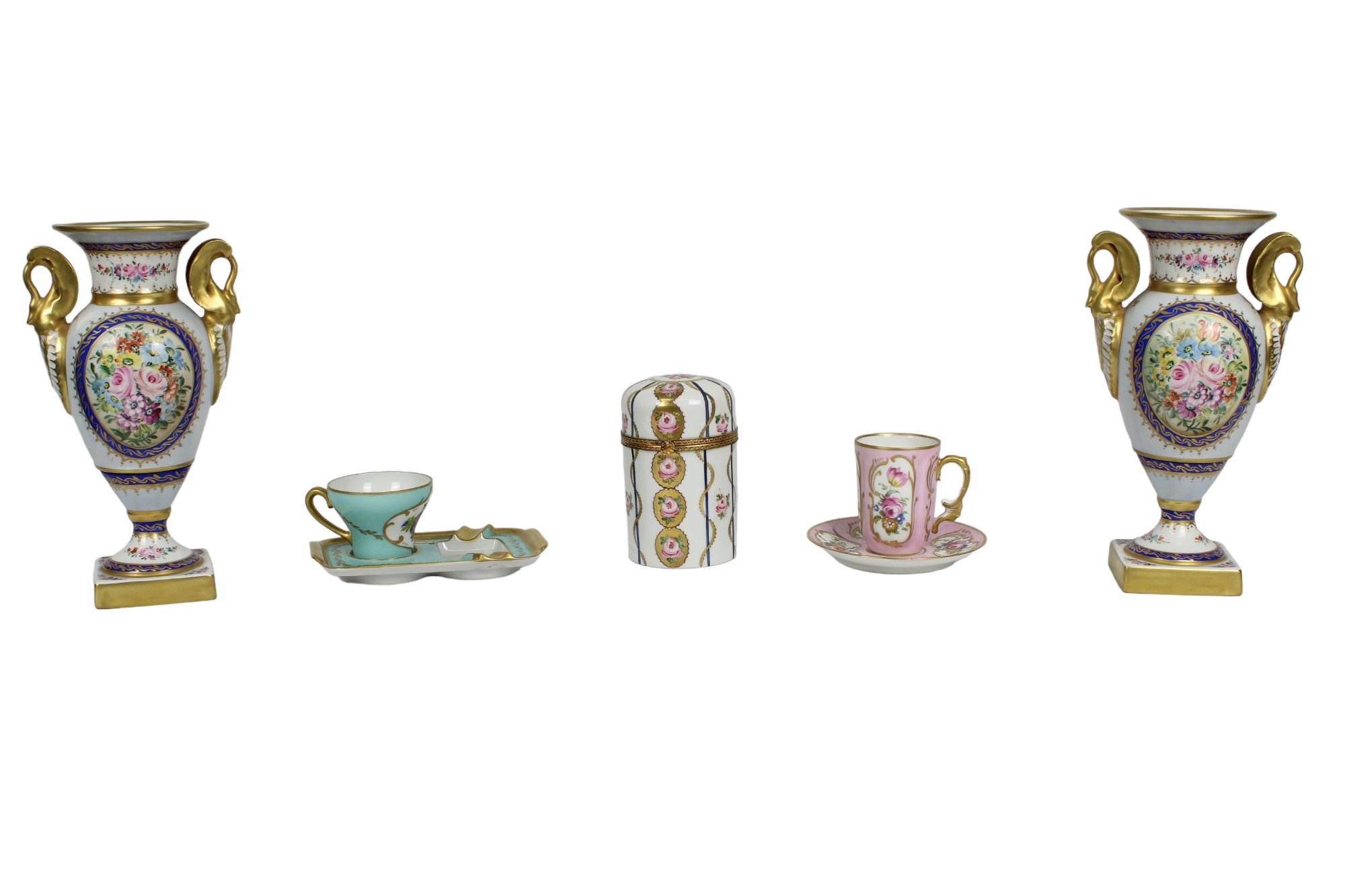 in porcellana di Limoges decorata di cui: 1 scatola da te, coppia vasi,1 tazza, 1 tazza con vassoio misure varie