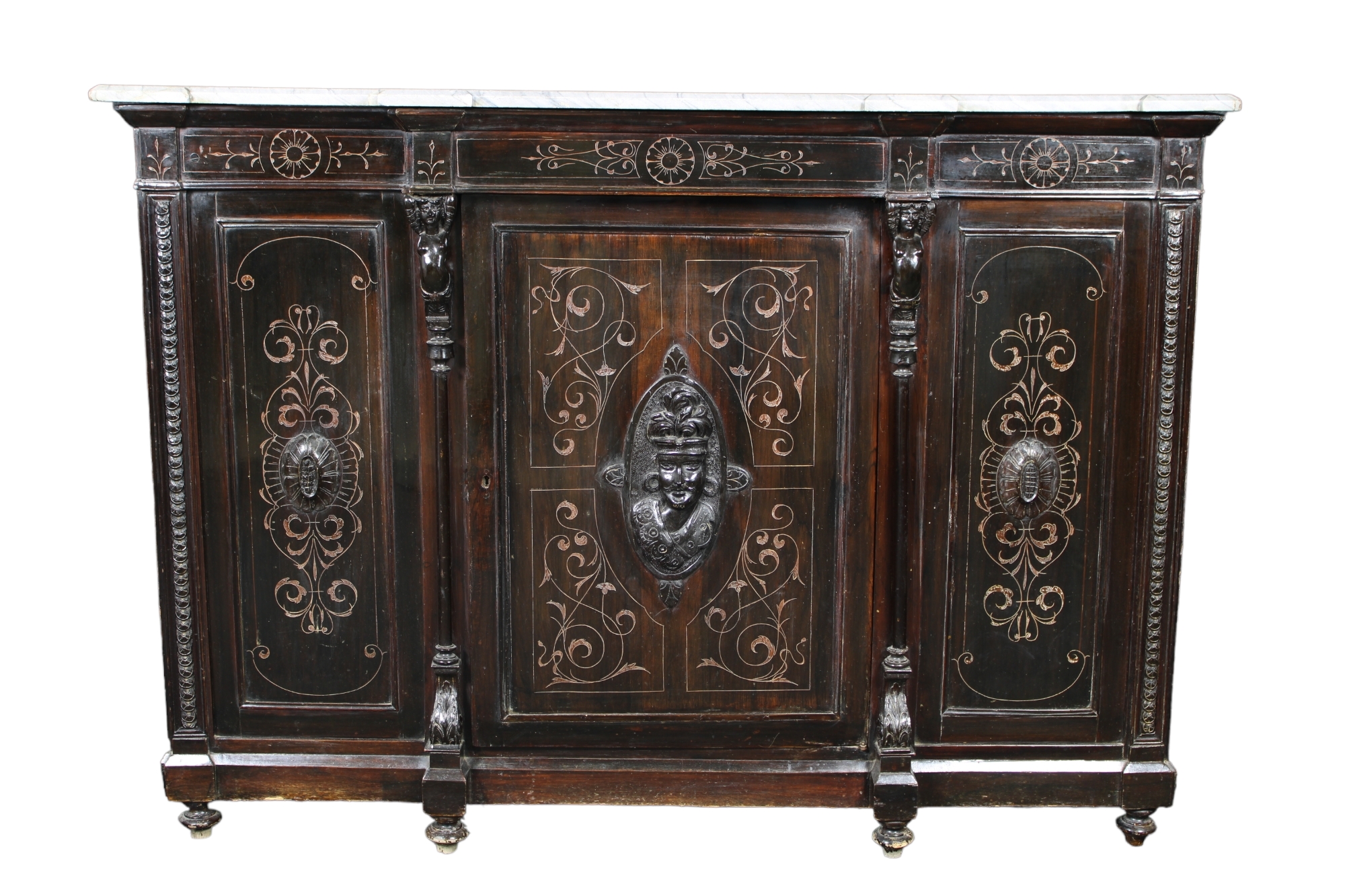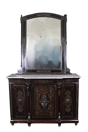 in noce con specchiera, ante riccamente intagliate a motivi vegetali e mascheroni Sicilia fine 800 h cm 242 x 147 x 48