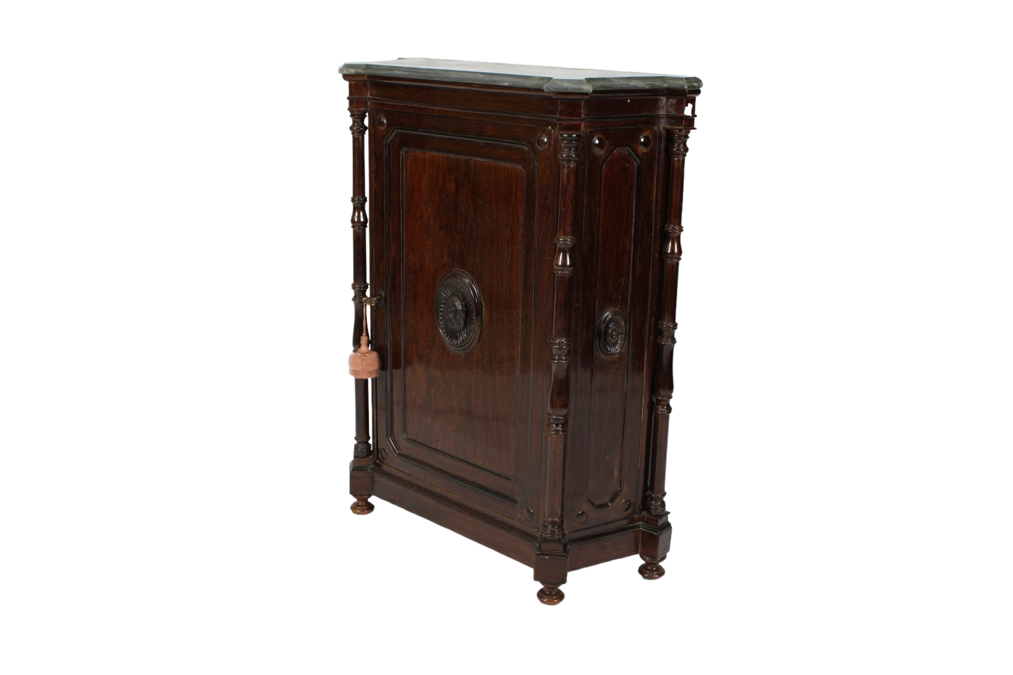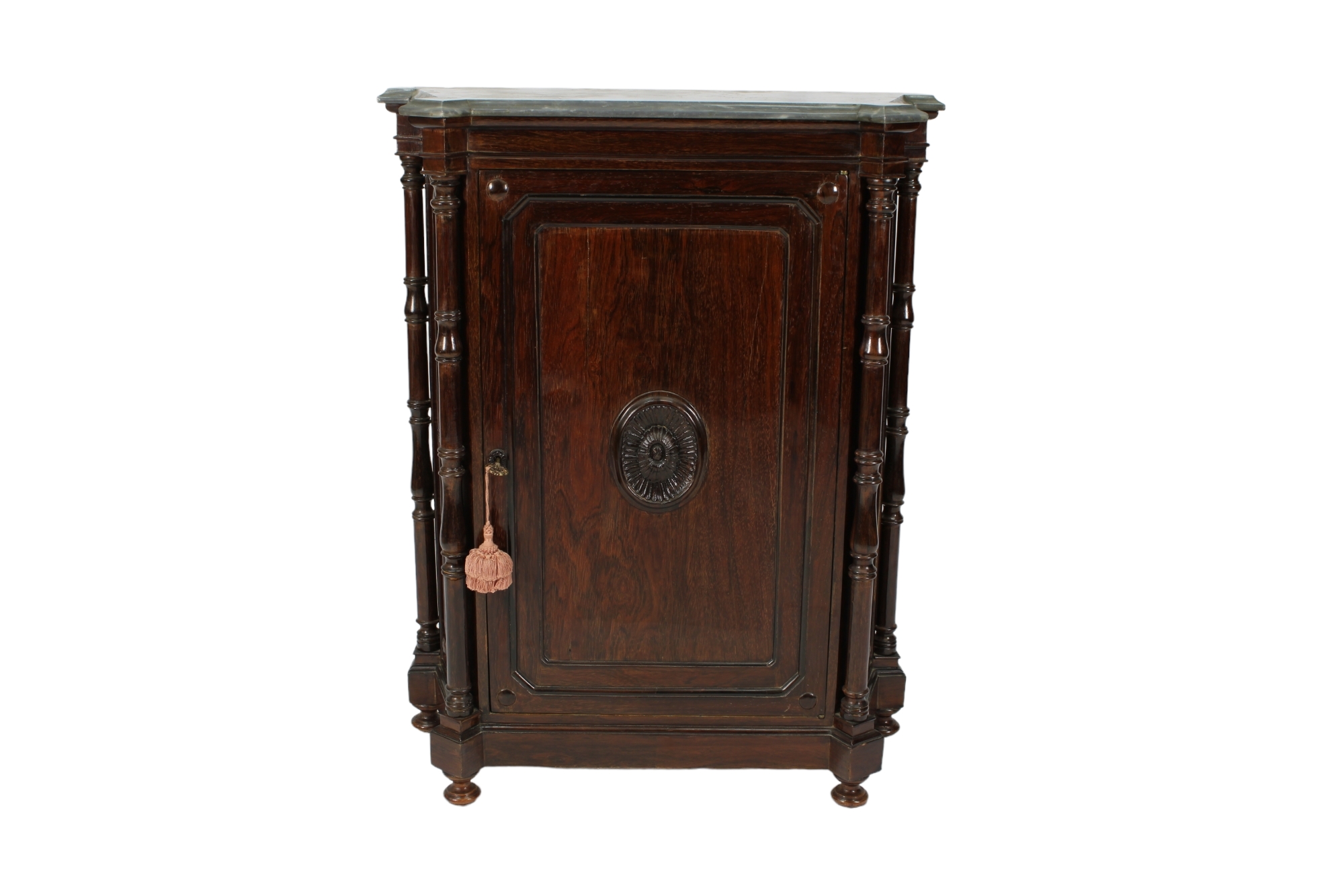 in palissandro ad 1 anta con rosone intagliato, lesene arricchite da colonne tornite e piano in marmo grigio Sicilia XIX secolo h cm 100 x 81 x 31