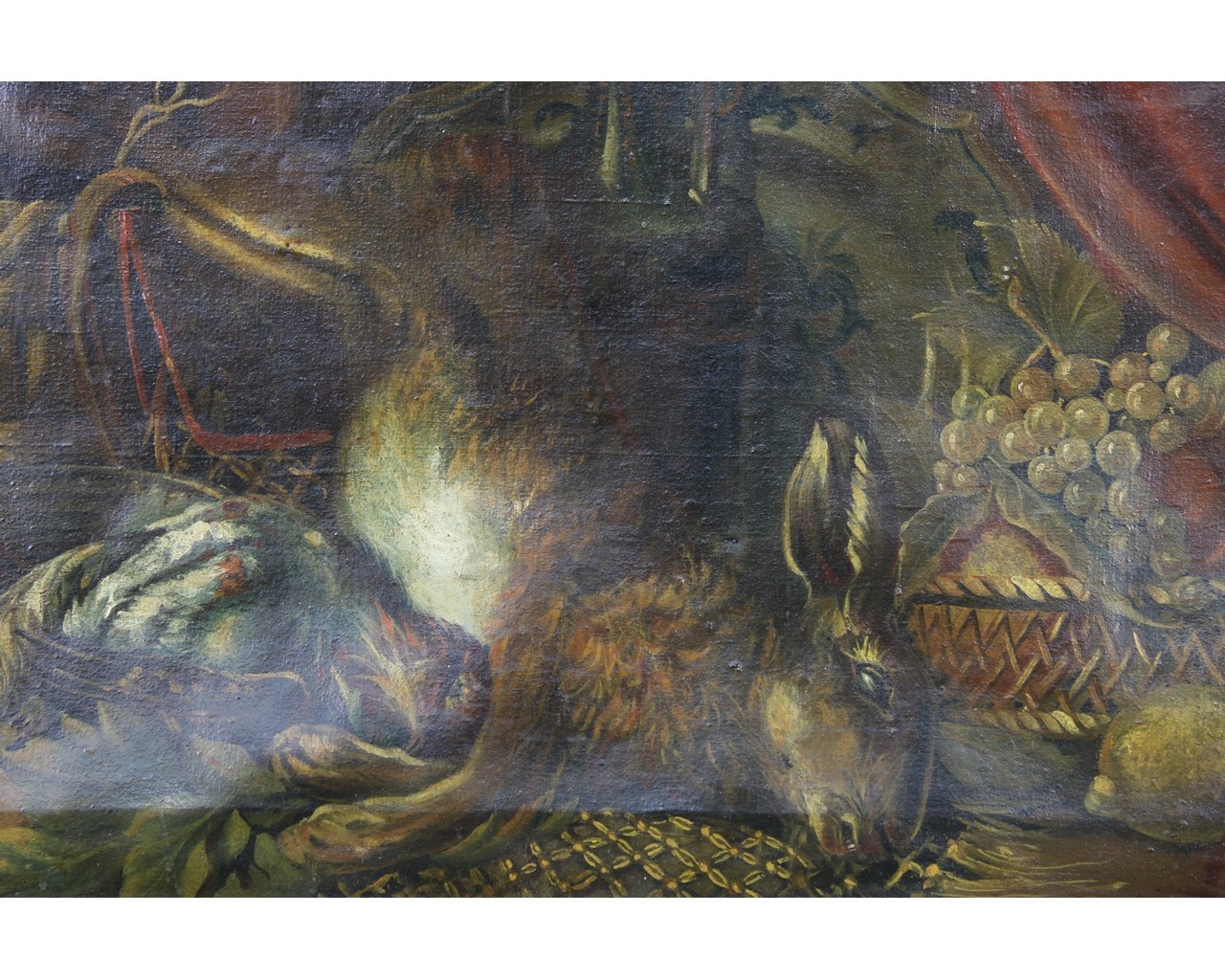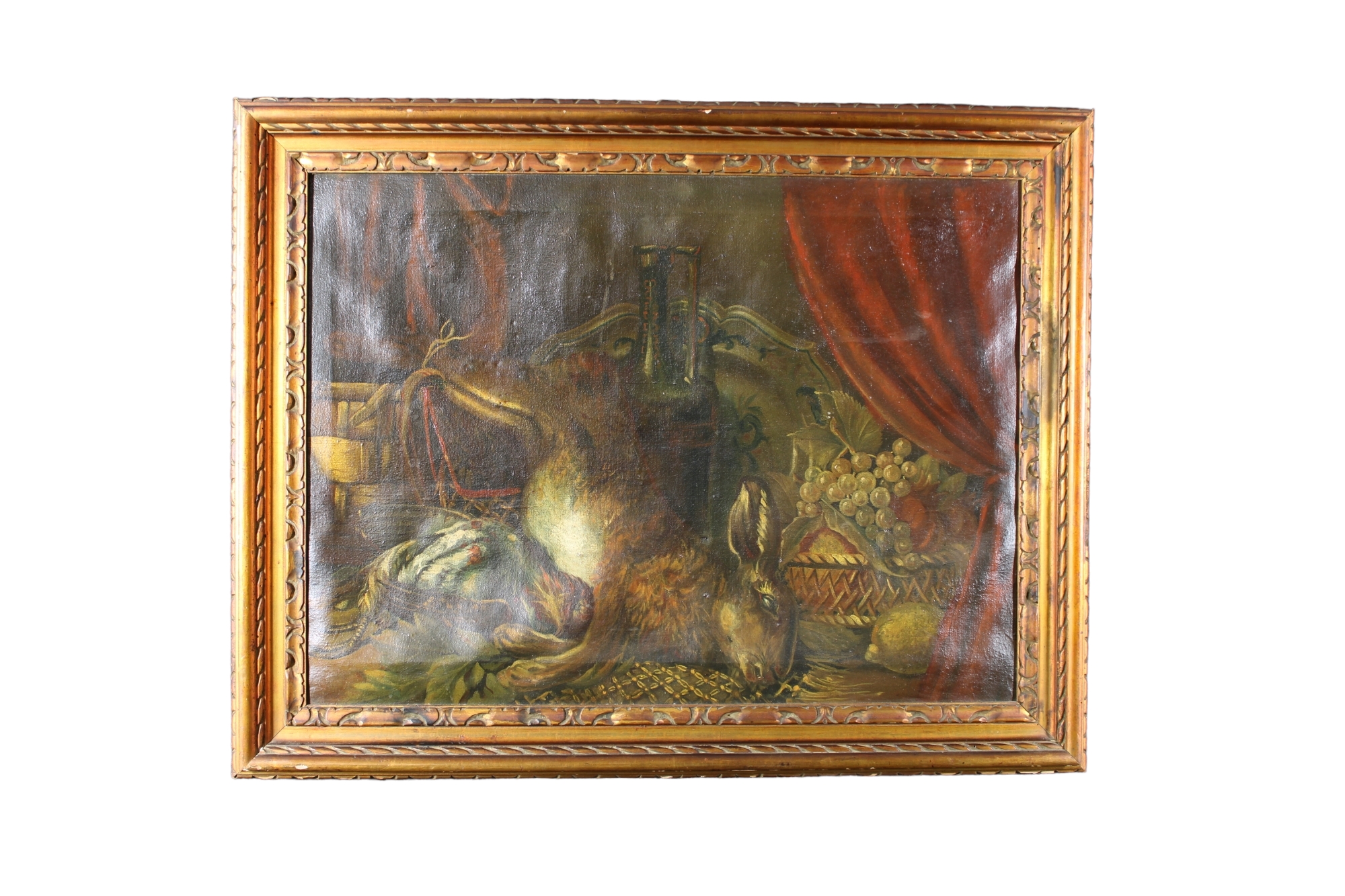 Raffigurante natura morta con cacciagione e frutti, dentro cornice dorata XVIII/XIX secolo h cm 60 x 80 / cornice h cm 76 x 69