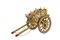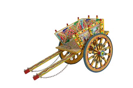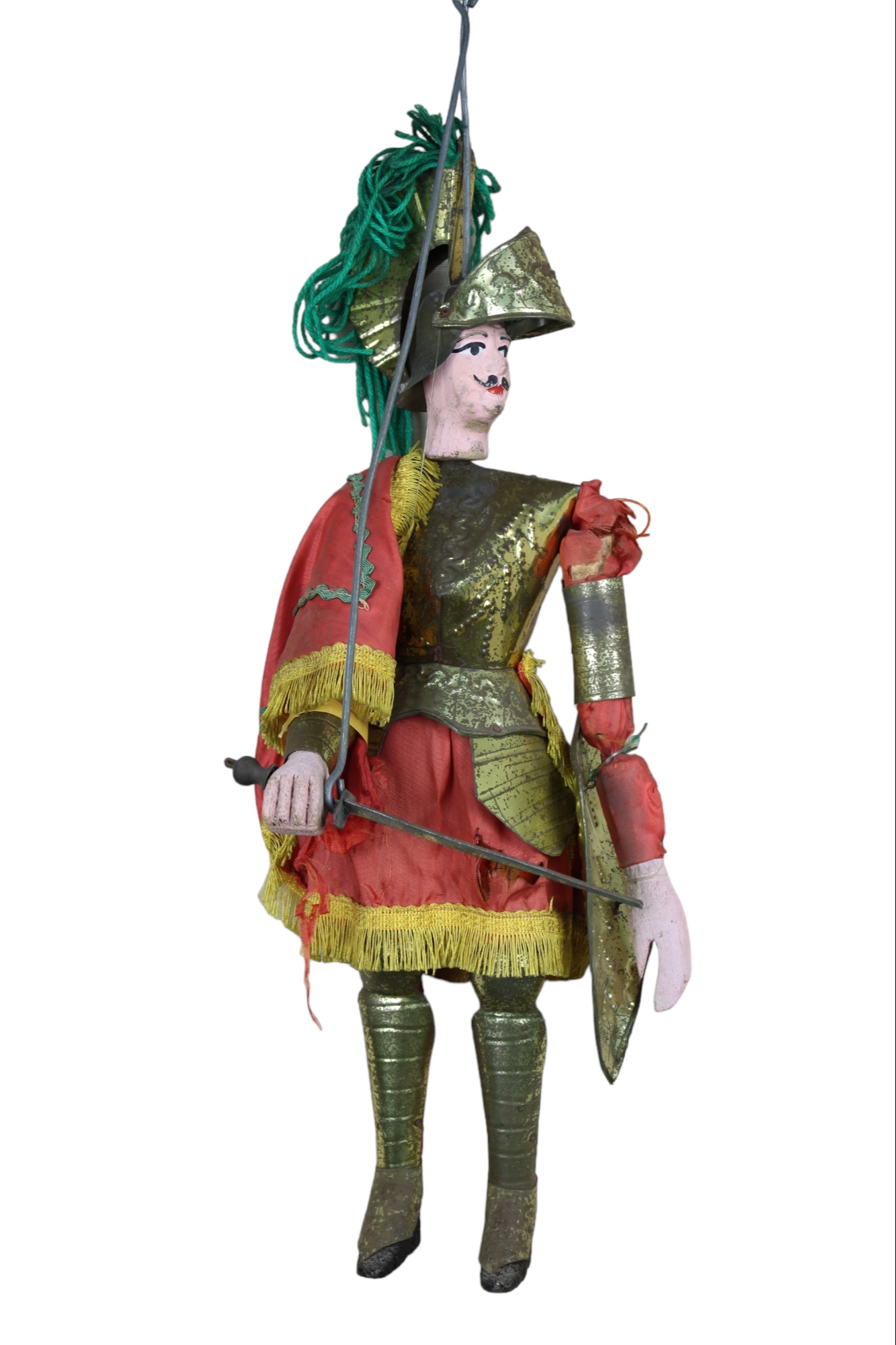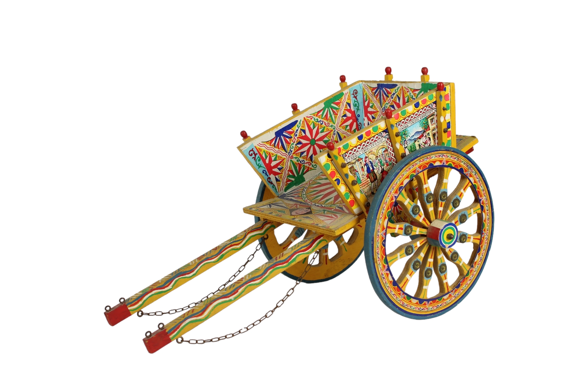 1 piccolo carretto in legno scolpito e dipinto a mano, 1 pupo siciliano struttura in legno abito in tessuto rosso, armatura in metallo finemente sbalzato a mano e 1 elemento in legno dipinto Sicilia XX secolo h cm 48 x 20 / h cm 105,5 x 16 / h cm 32 x 52 x 25