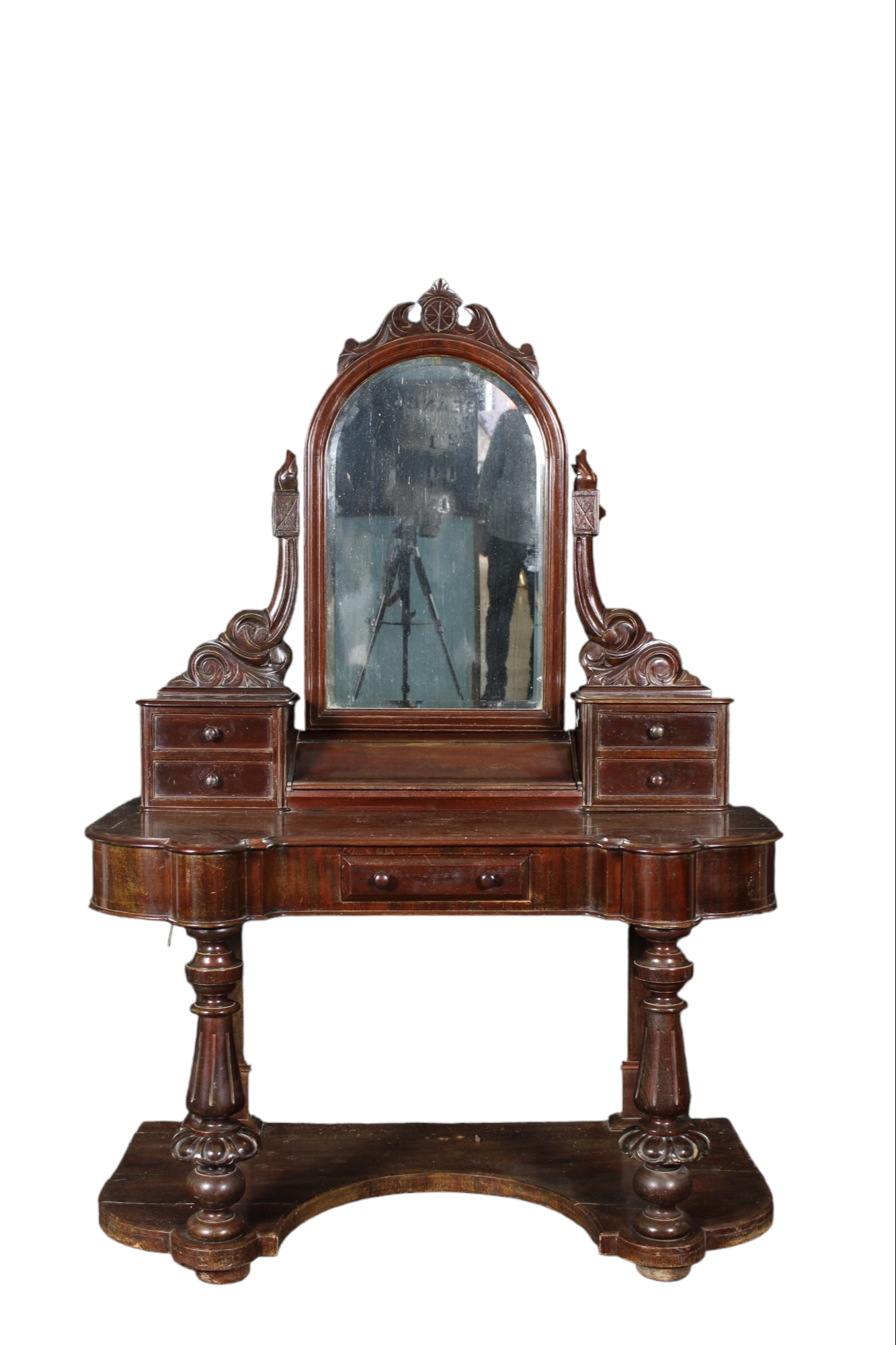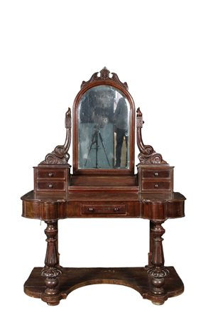 in mogano, con specchio basculante, cimasa intagliata Inghilterra XIX secolo h cm 172 x 120 x 58