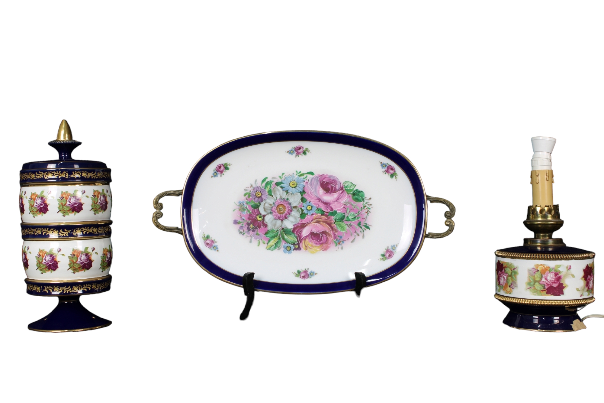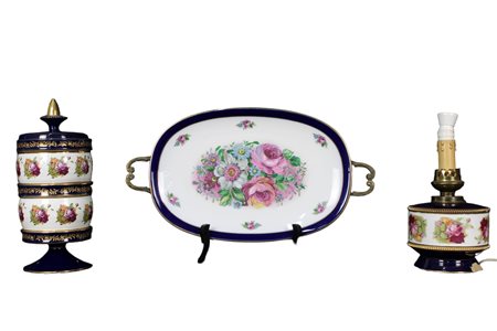 in porcellana decorata di cui 1 lume, 1 centrotavola e 1 potiche vecchia fattura misure varie