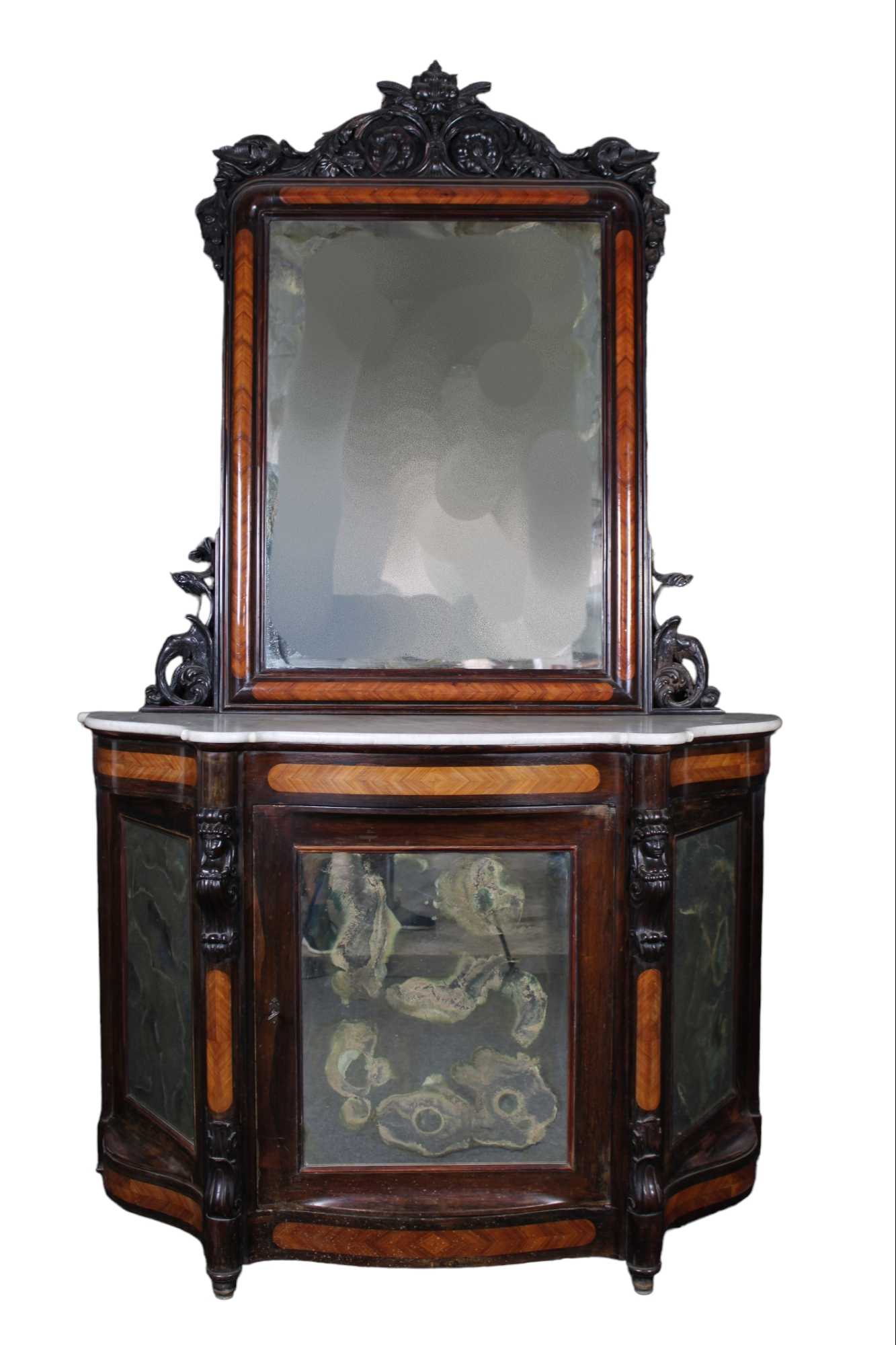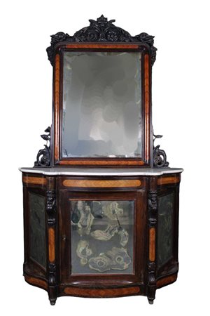 in palissandro e acero di forma sagomata, lesene con erme femminili, piano in marmo bianco sormontato da specchiera decorata da fregi riccamente intagliati Sicilia XIX secolo h cm 255 x 155 x 60