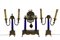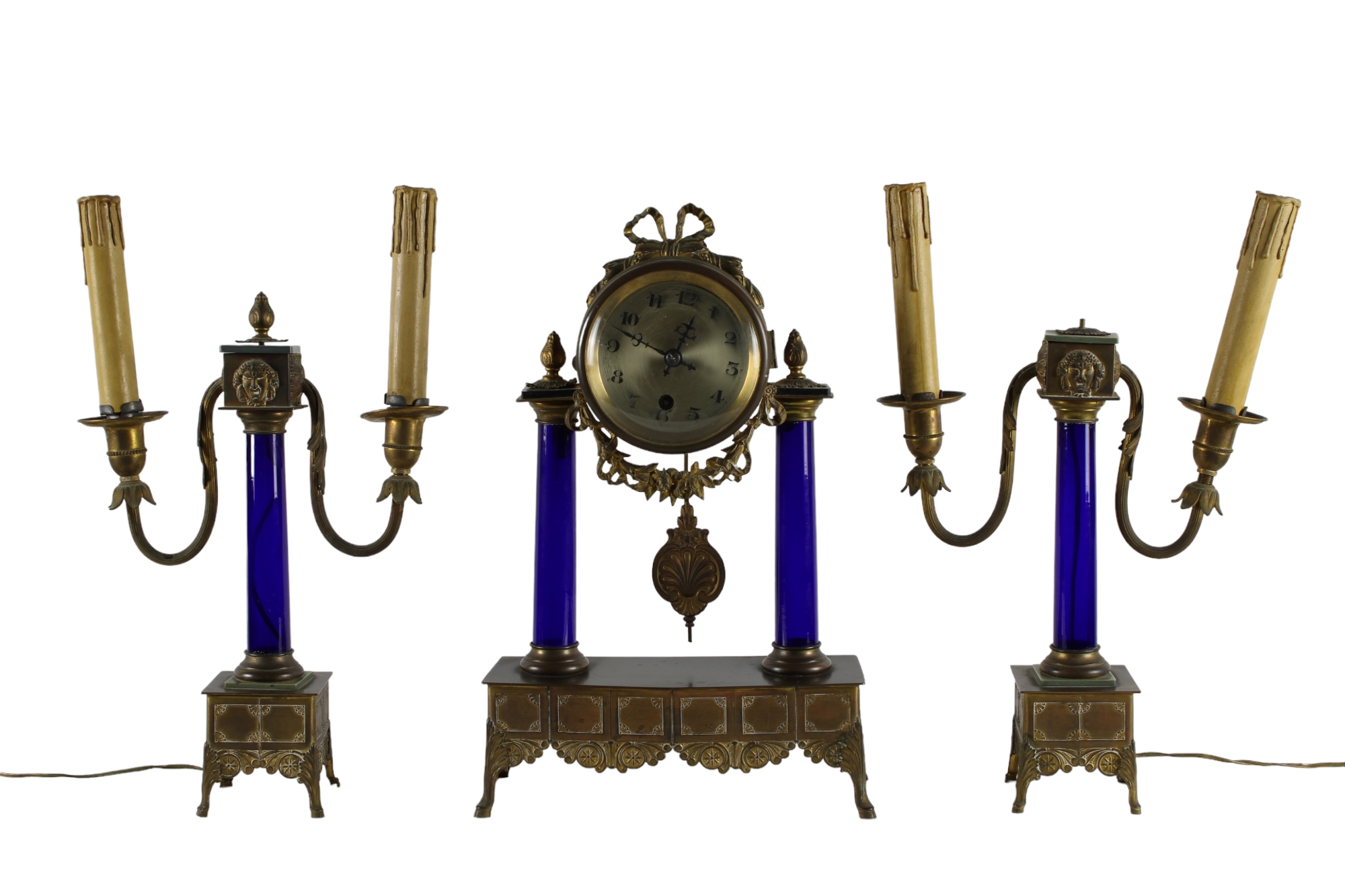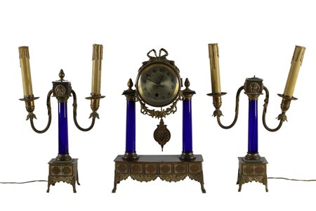 in ottone cesellato e porcellana composto da: orologio sostenuto da due colonne in porcellana e candelieri a 2 fiamme vintage Itallia h cm 37,5 x 24 x 10 / h cm 32 x 23 x 8