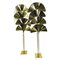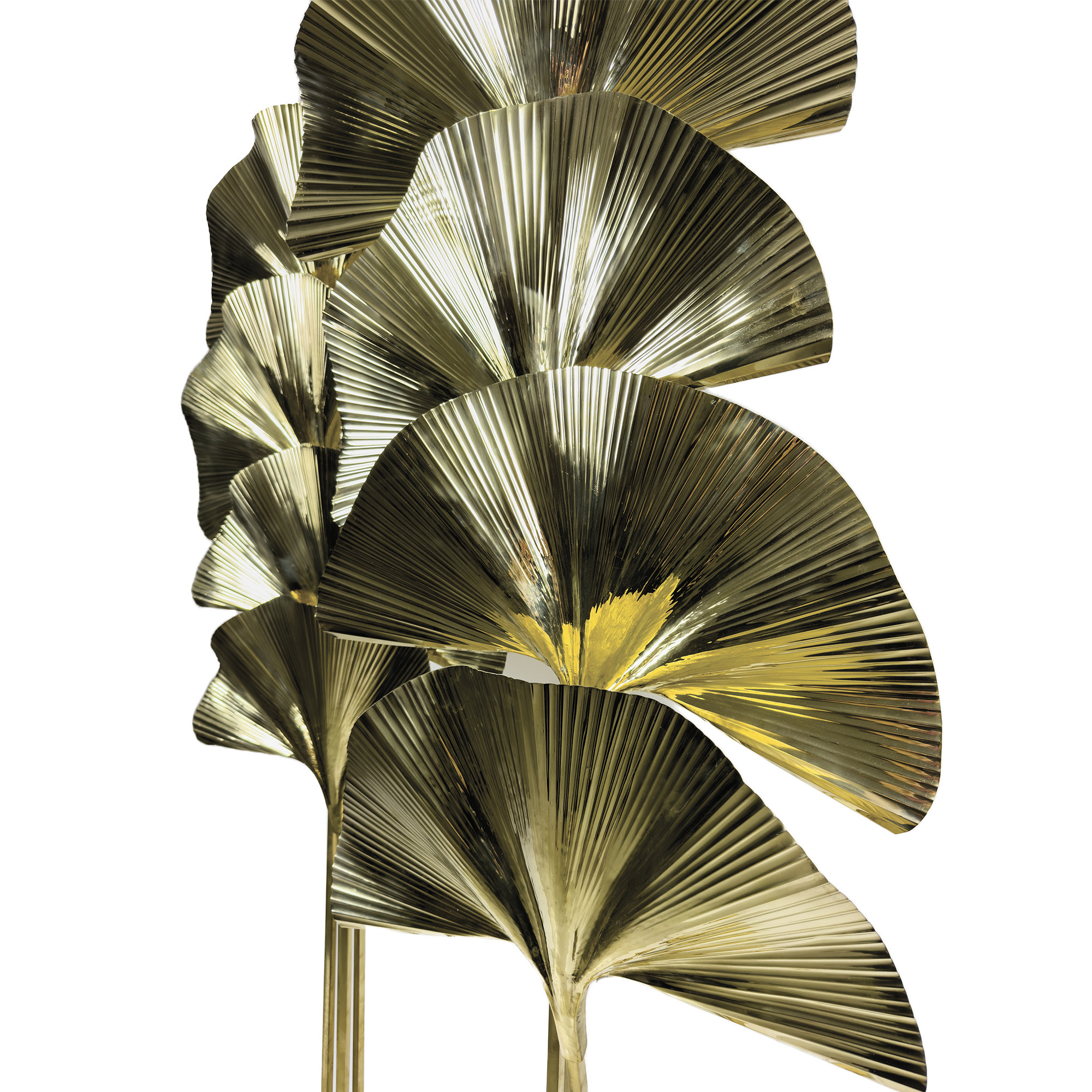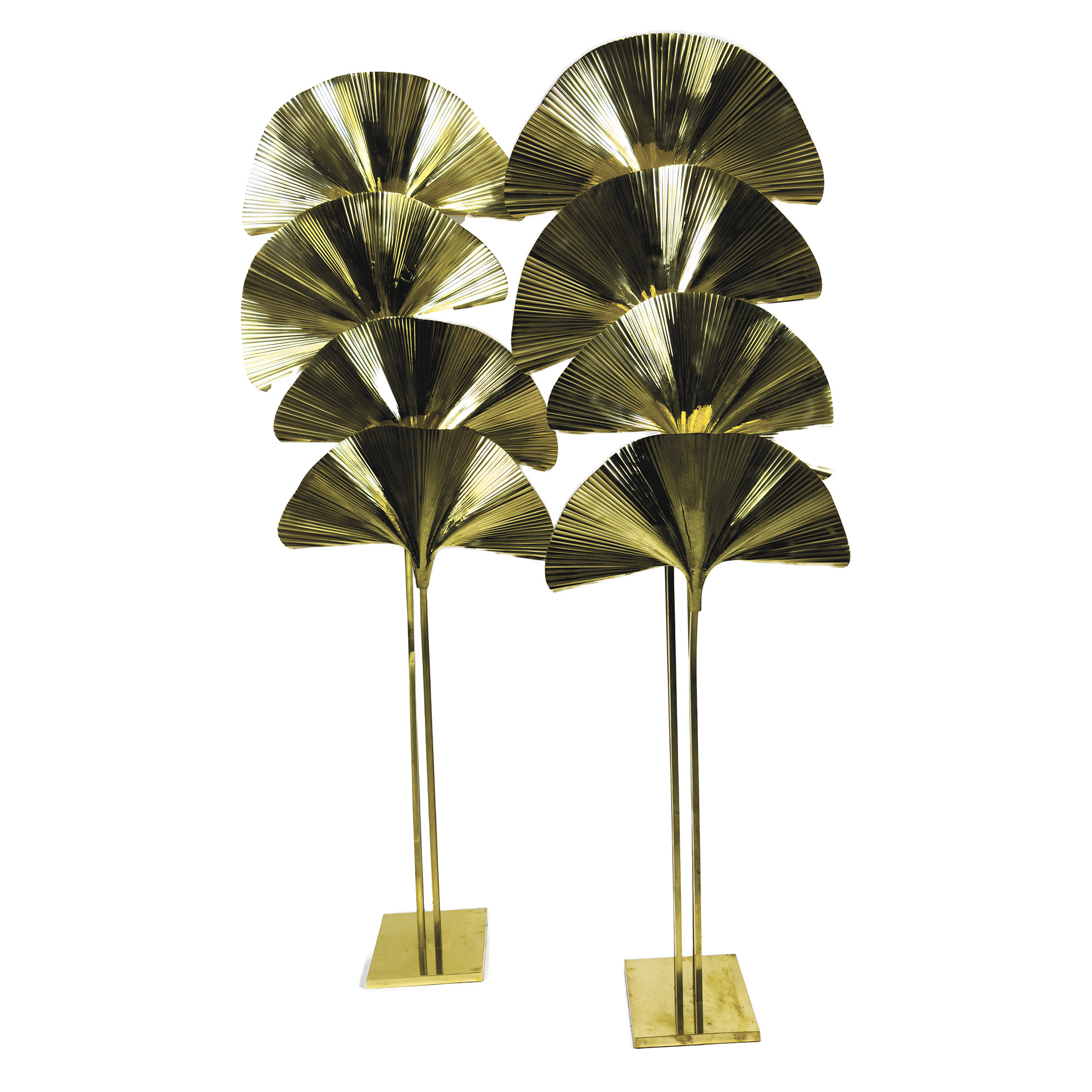 Coppia di piantane in ottone a quattro luci, XX secolo, caratterizzate da un diffusore a forma di quattro foglie di papiro sovrapposte; base quadrata, cm. 225x66 circa