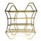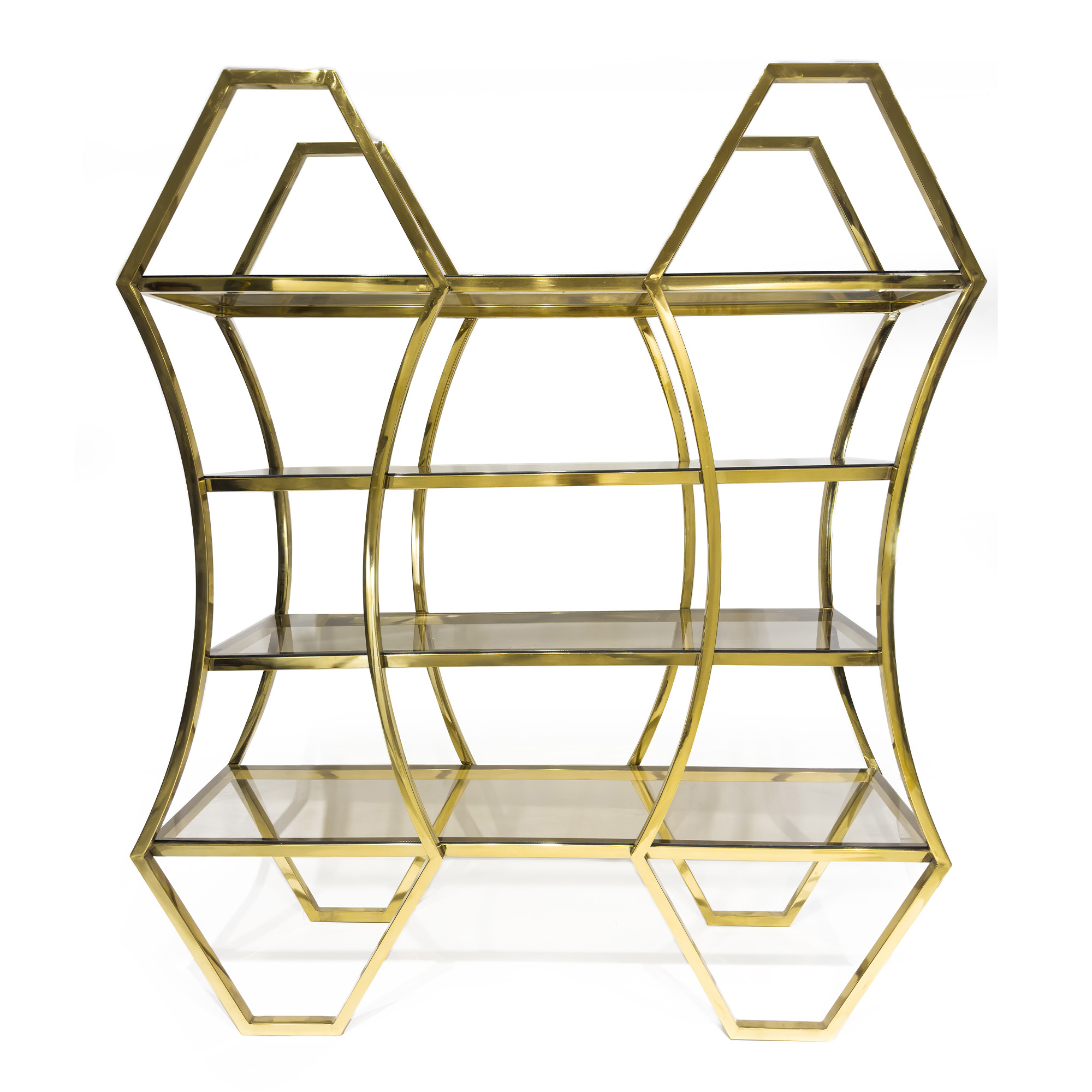 Libreria in ottone con montanti sagomati, XX secolo, a quattro ripiani in vetro, cm. 180x160x45